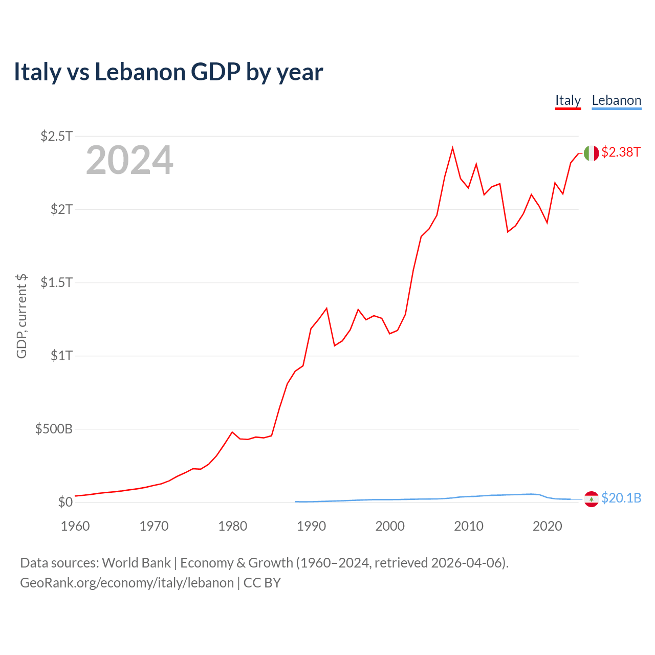 Italy has a GDP of $2.38T compared to $20.1B for Lebanon, ranking 8/197 and 128/197 by economy size, respectively.