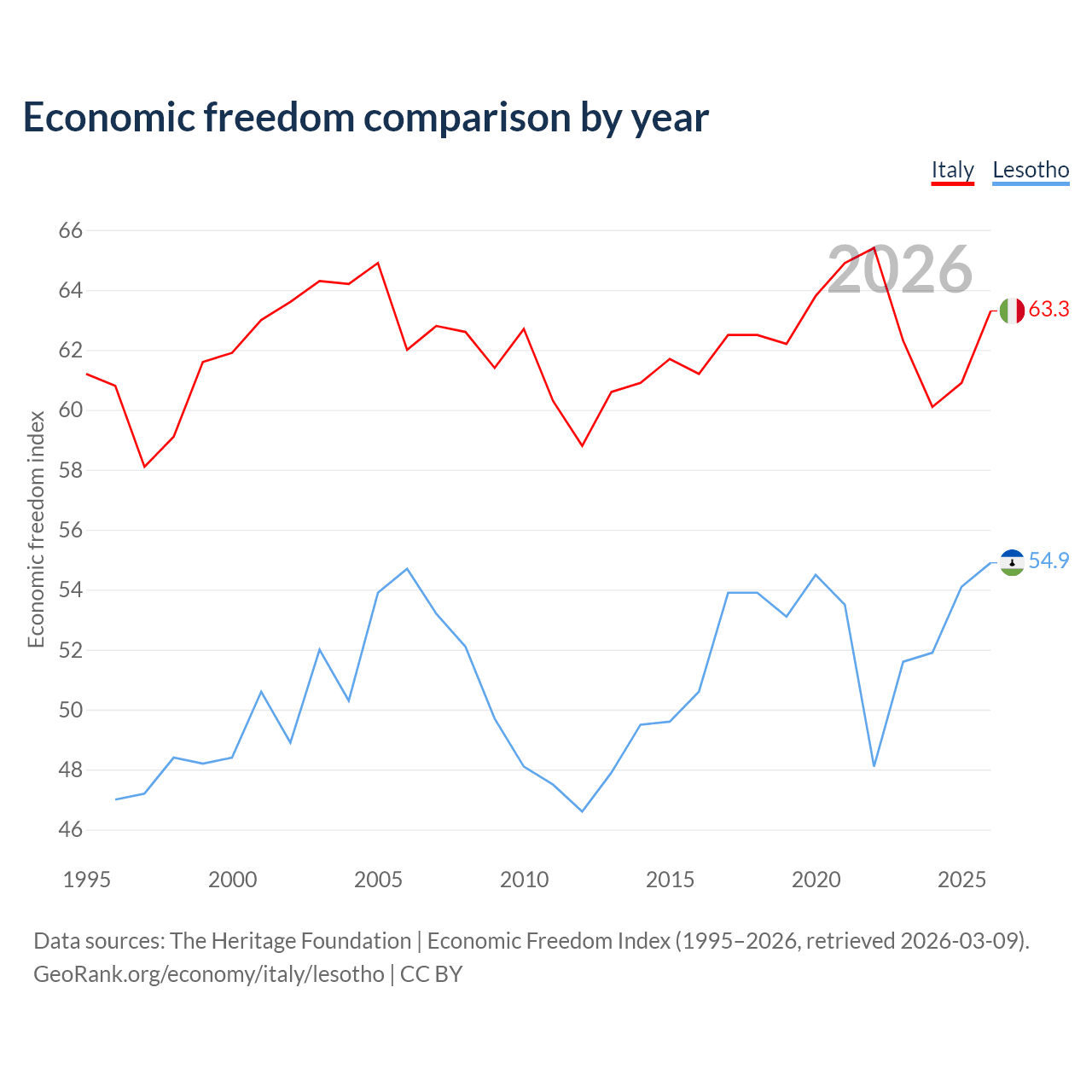 The Economic Freedom Index for Italy is 63.3, ranking 80/197, compared to 54.9 for Lesotho, ranking 130/197. The chart above displays a comparison of annual changes in economic freedom indexes.