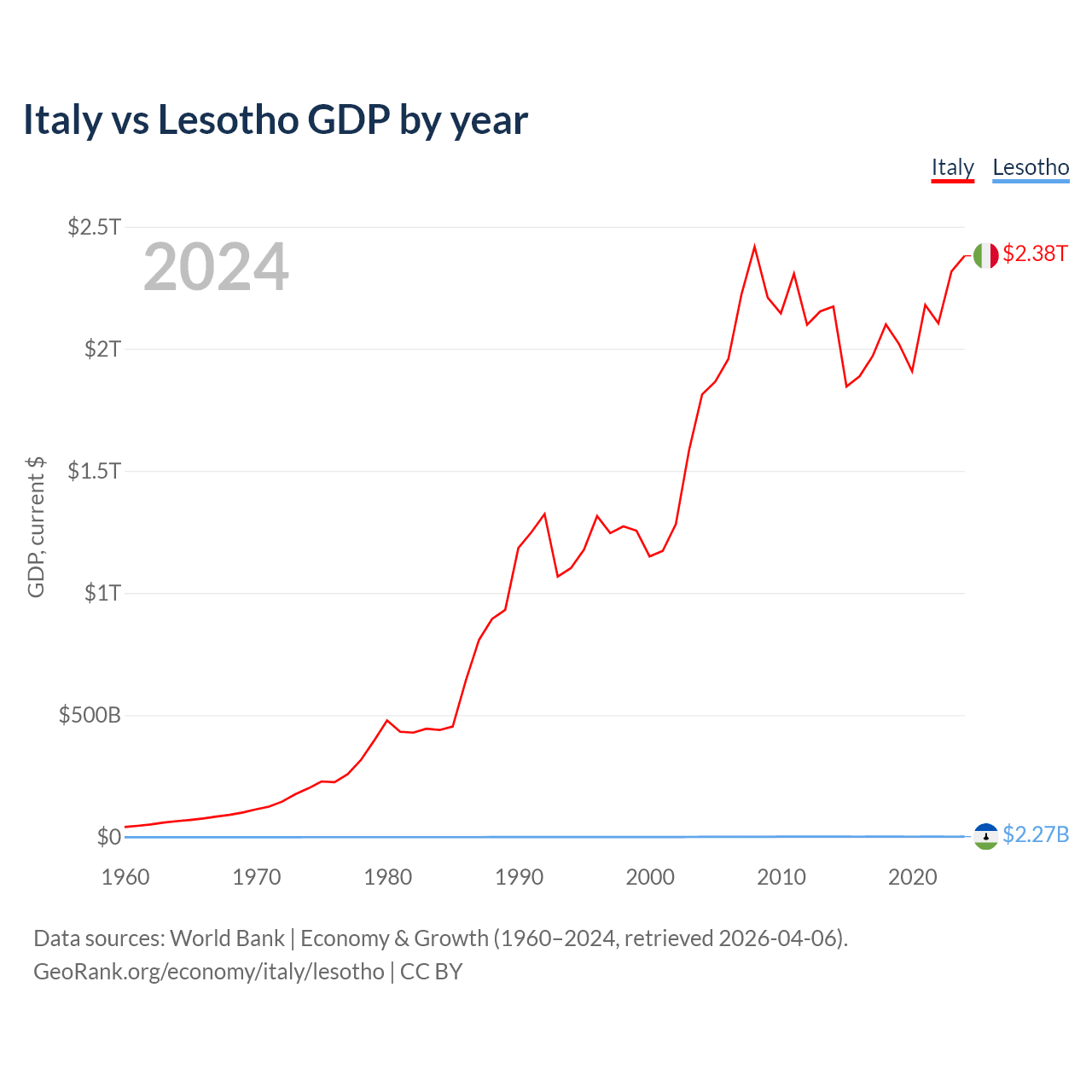 Italy has a GDP of $2.38T compared to $2.27B for Lesotho, ranking 8/197 and 175/197 by economy size, respectively.