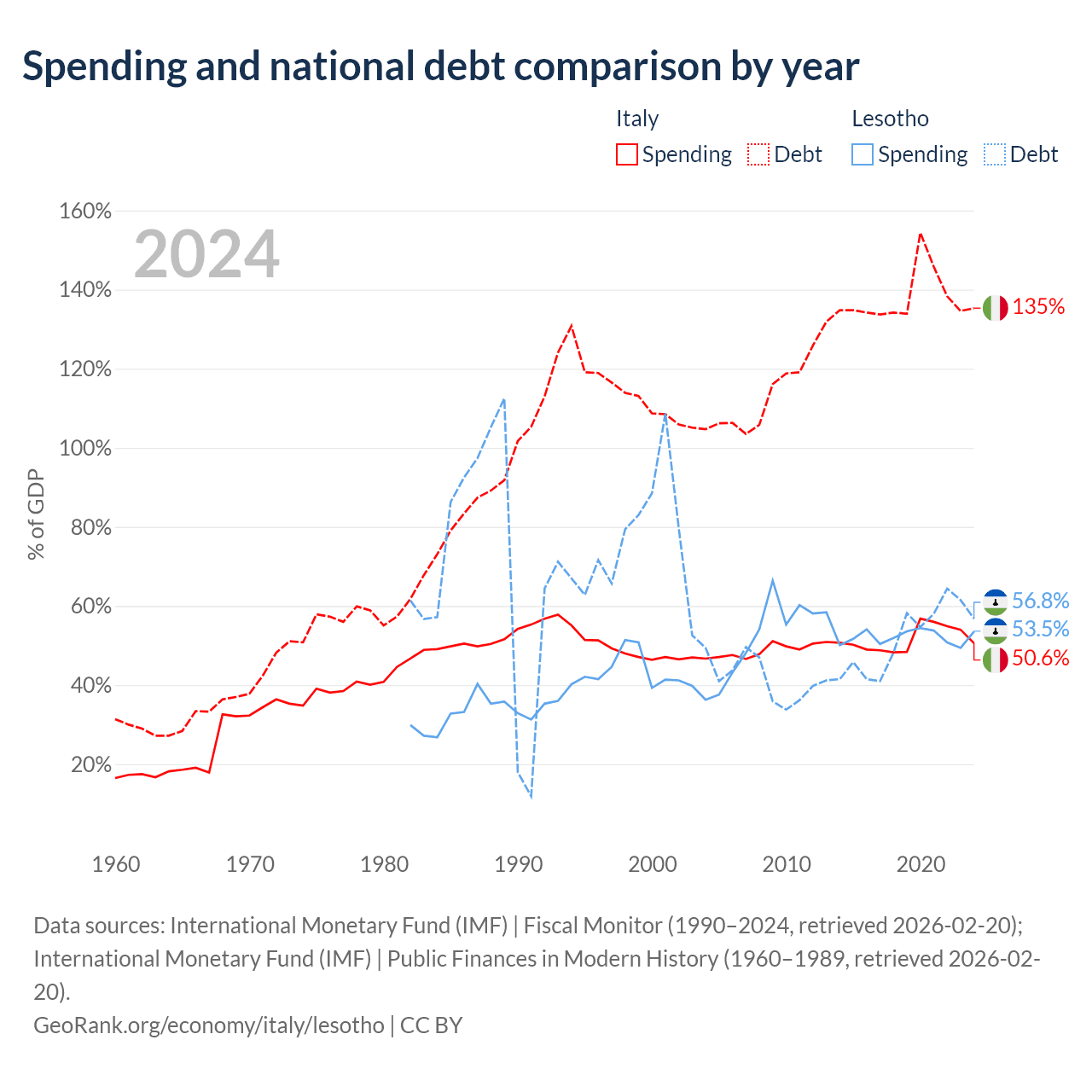 Italy has $3.22T in government debt (135.3% of GDP), compared to $1.29B (56.8% of GDP) in Lesotho.