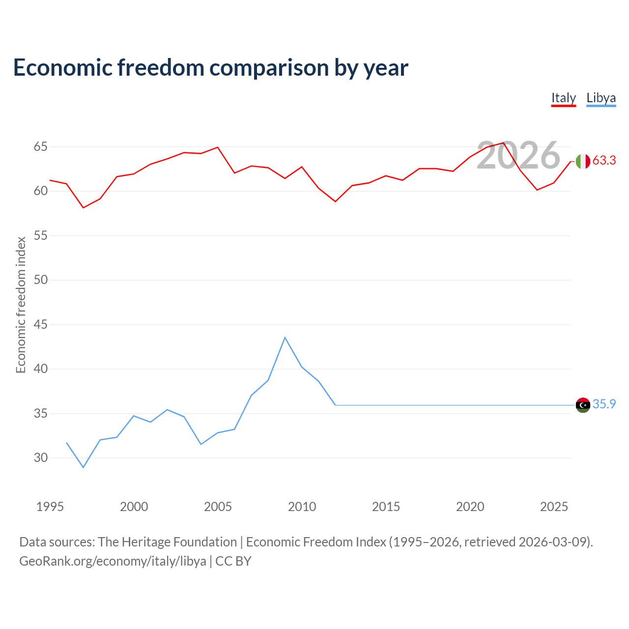 The Economic Freedom Index for Italy is 63.3, ranking 80/197, compared to 35.9 for Libya, ranking 189/197. The chart above displays a comparison of annual changes in economic freedom indexes.