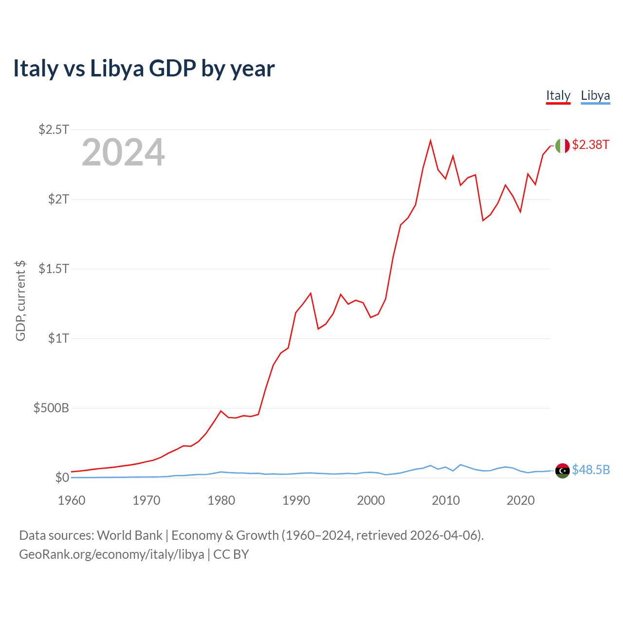 Italy has a GDP of $2.38T compared to $48.5B for Libya, ranking 8/197 and 95/197 by economy size, respectively.