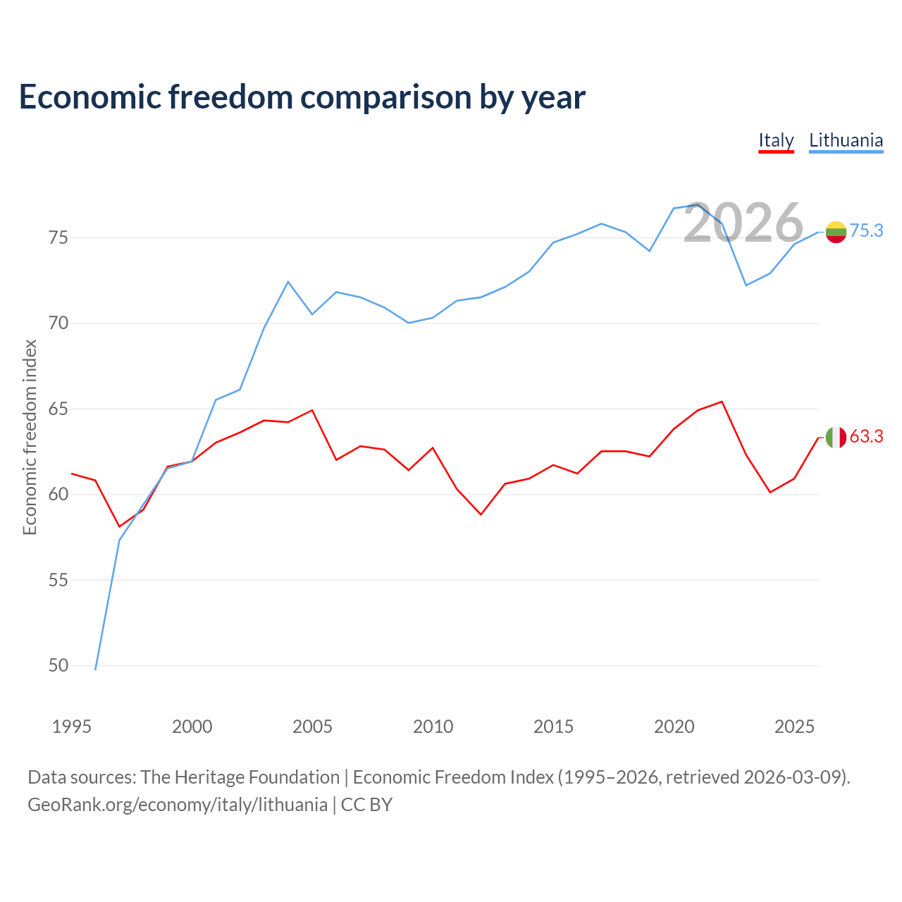 The Economic Freedom Index for Italy is 63.3, ranking 80/197, compared to 75.3 for Lithuania, ranking 18/197. The chart above displays a comparison of annual changes in economic freedom indexes.