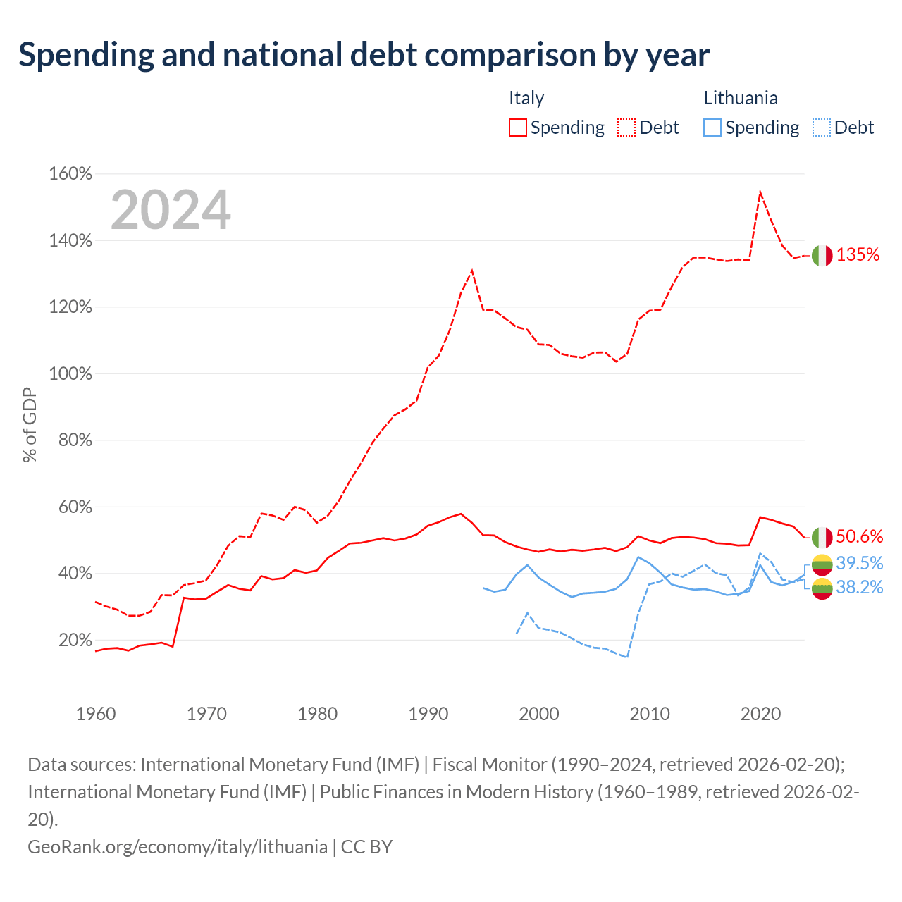 Italy has $3.22T in government debt (135.3% of GDP), compared to $32.4B (38.2% of GDP) in Lithuania.