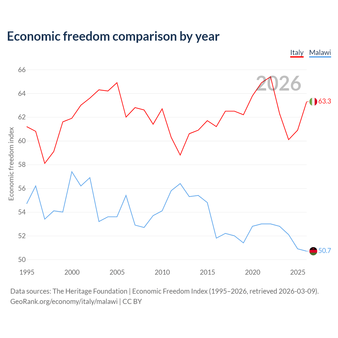 The Economic Freedom Index for Italy is 63.3, ranking 80/197, compared to 50.7 for Malawi, ranking 159/197. The chart above displays a comparison of annual changes in economic freedom indexes.