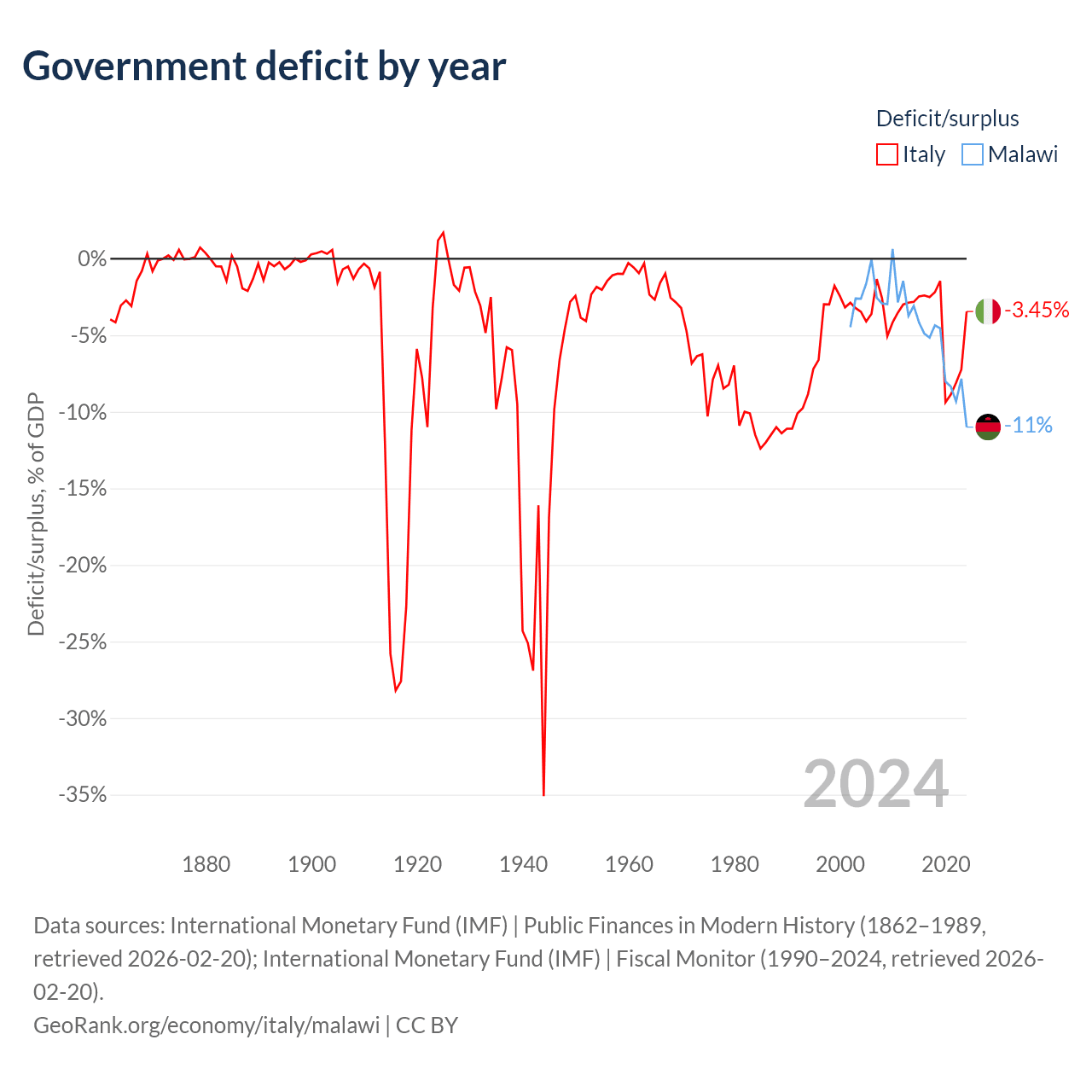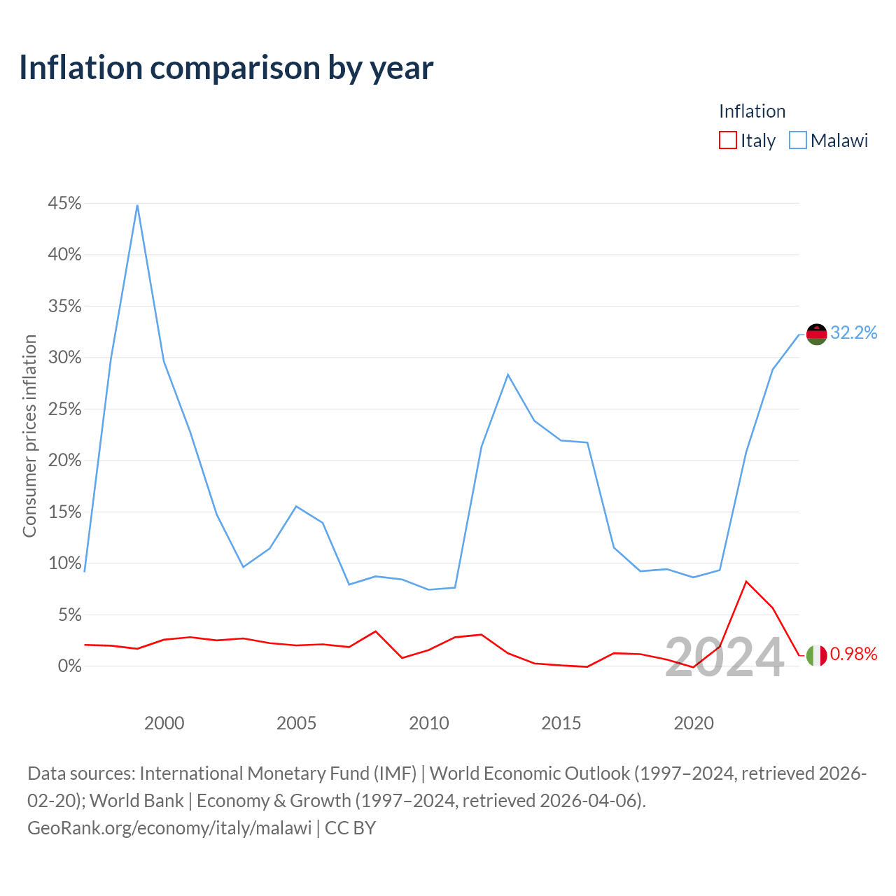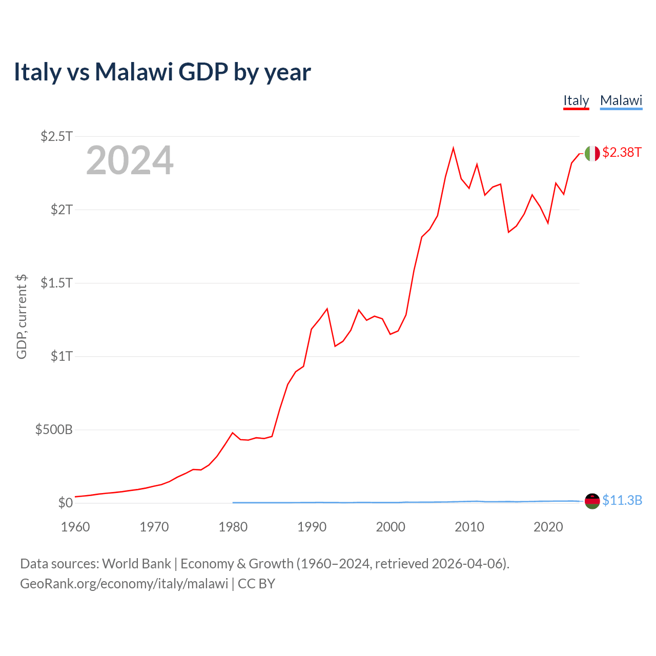 Italy has a GDP of $2.38T compared to $11.3B for Malawi, ranking 8/197 and 151/197 by economy size, respectively.
