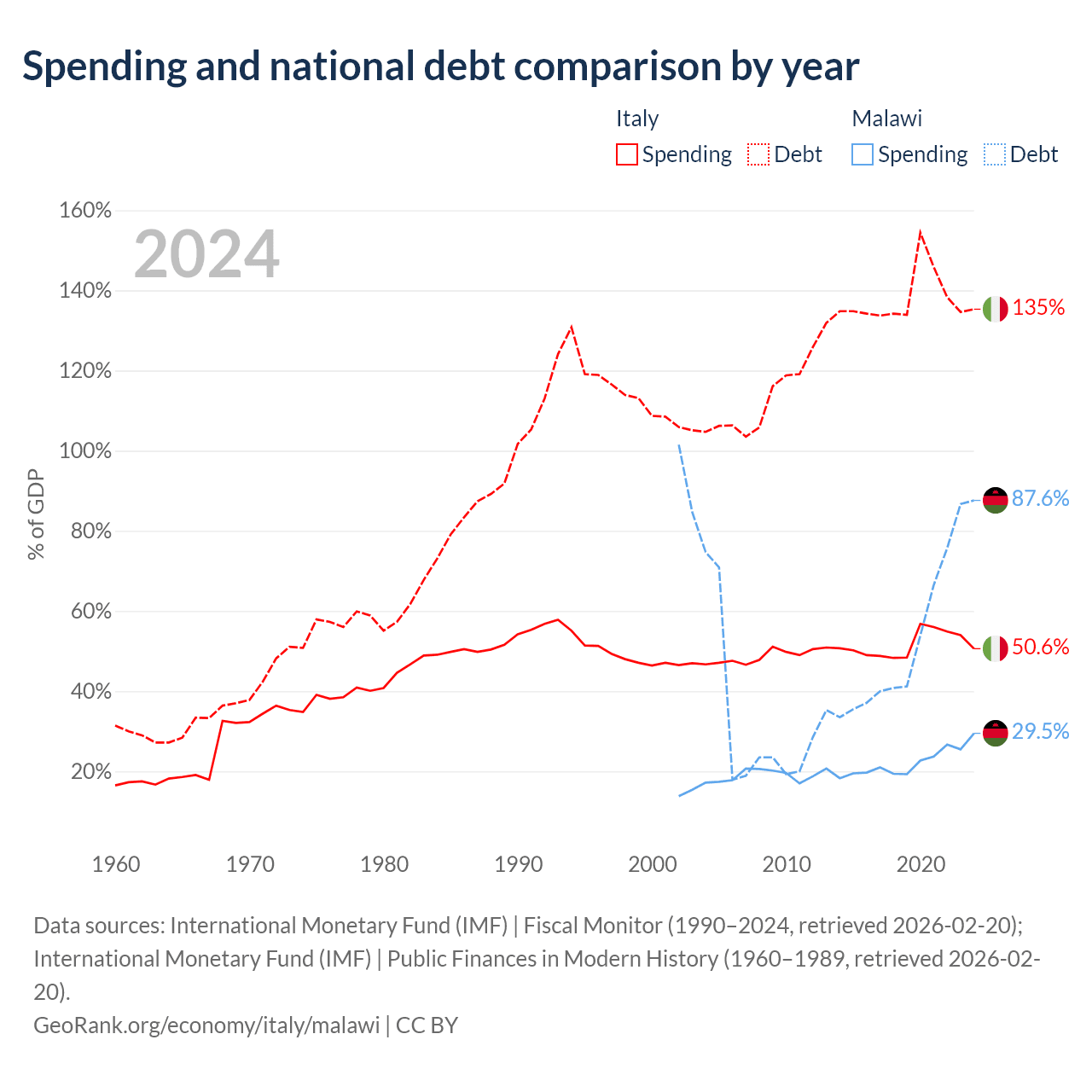 Italy has $3.22T in government debt (135.3% of GDP), compared to $9.91B (87.6% of GDP) in Malawi.