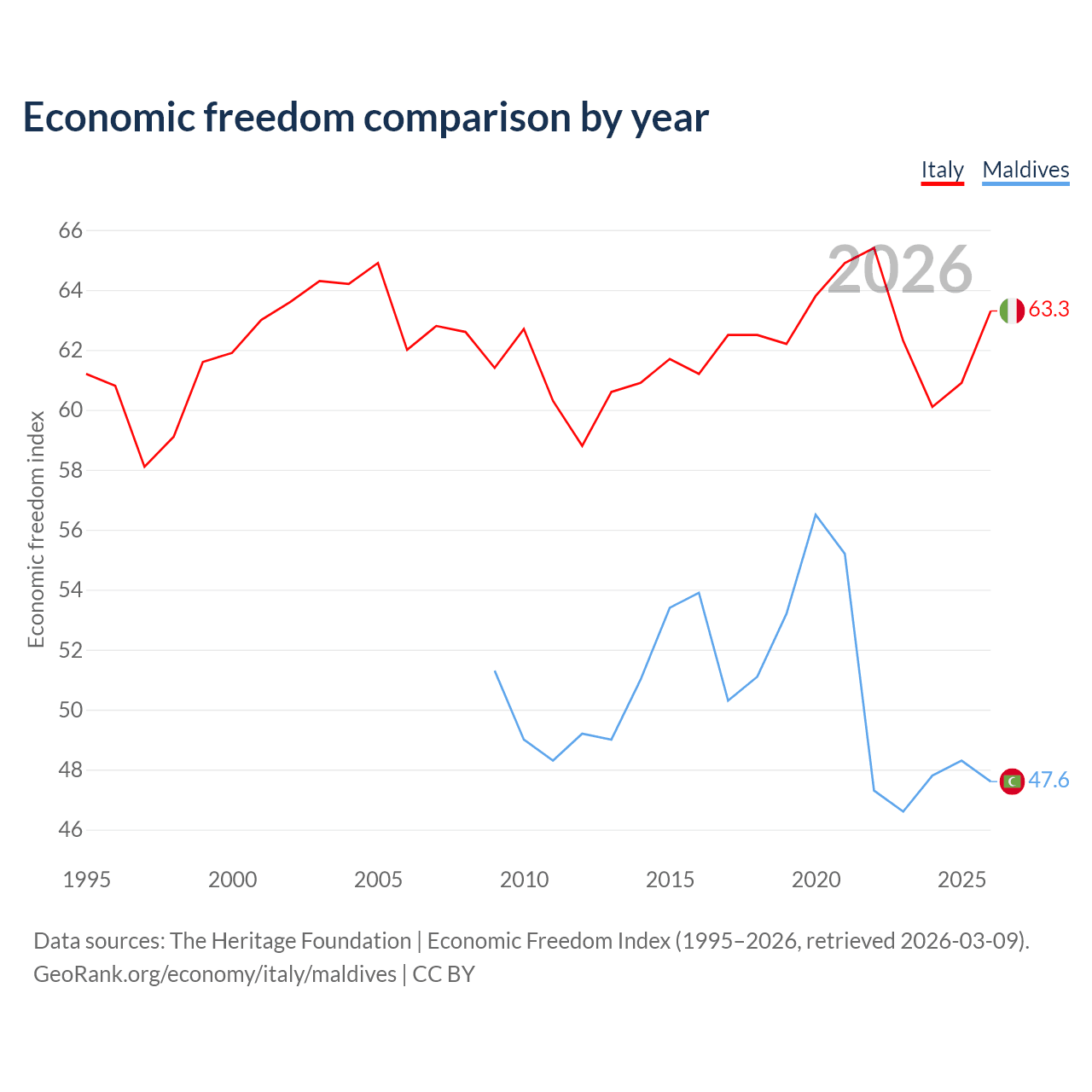 The Economic Freedom Index for Italy is 63.3, ranking 80/197, compared to 47.6 for Maldives, ranking 174/197. The chart above displays a comparison of annual changes in economic freedom indexes.