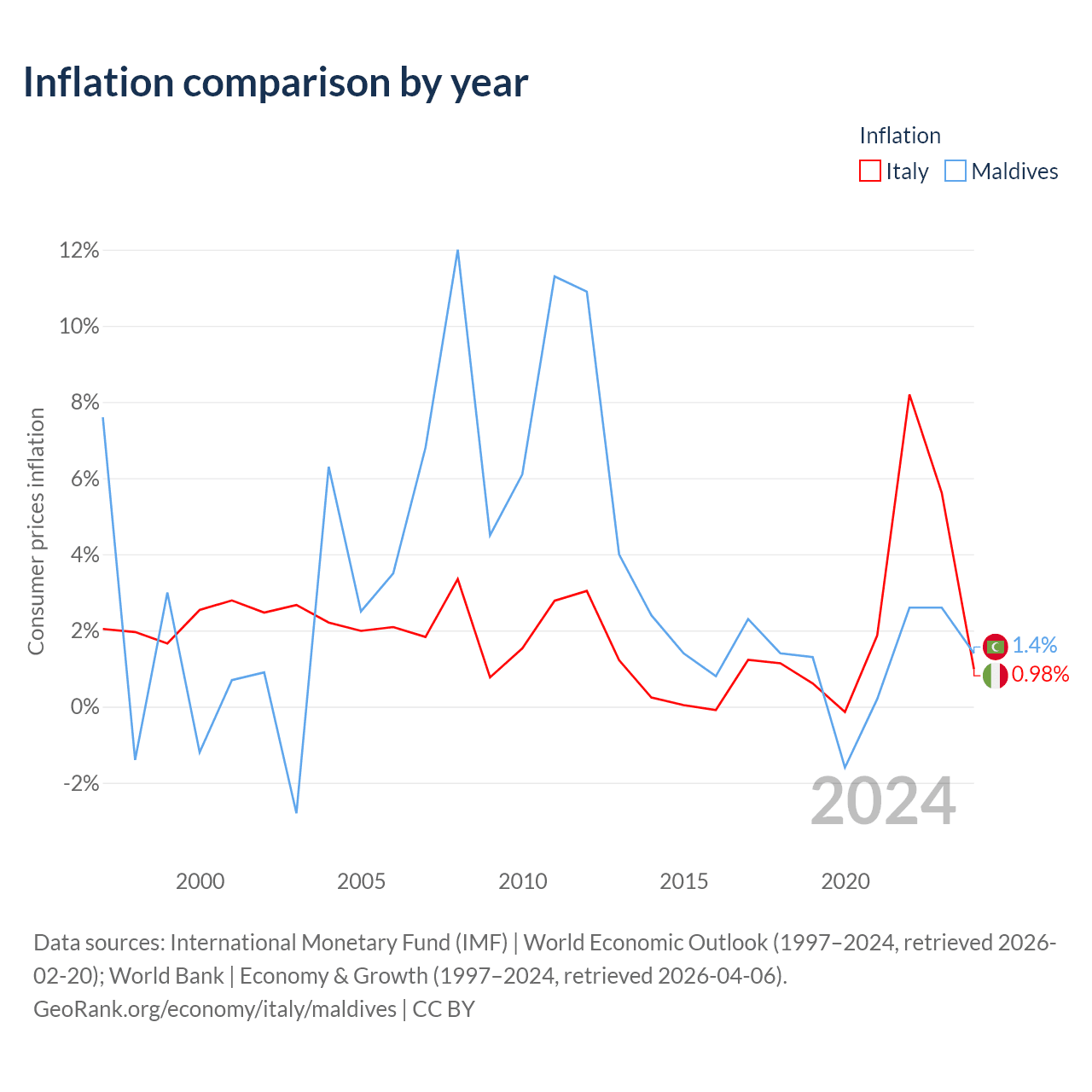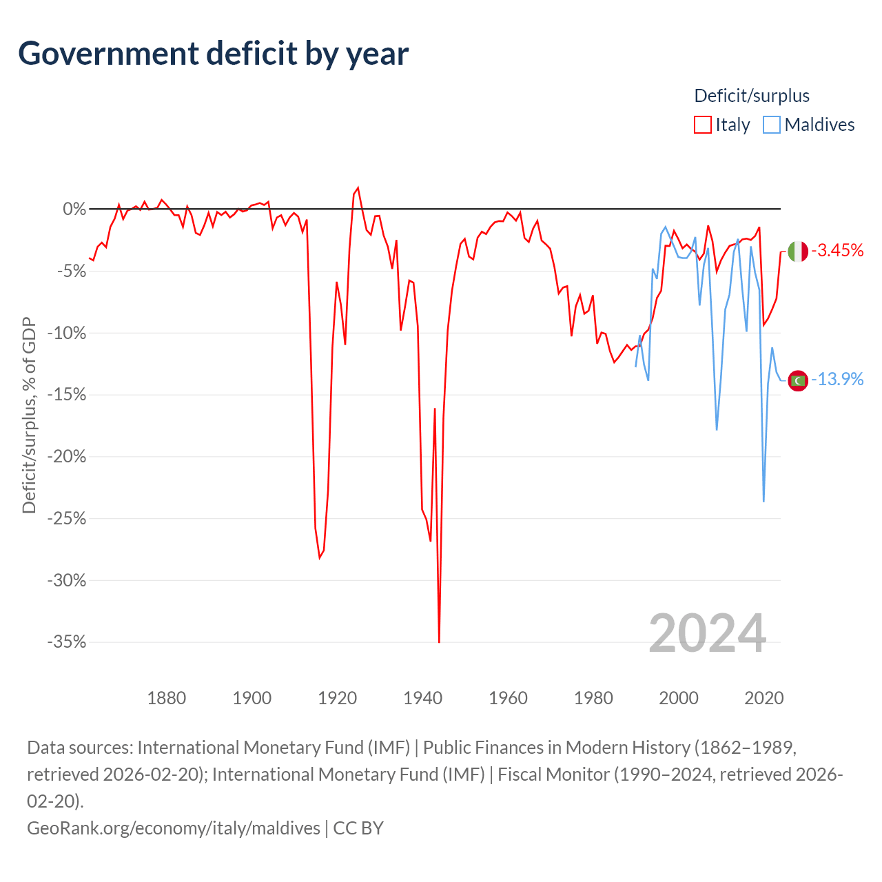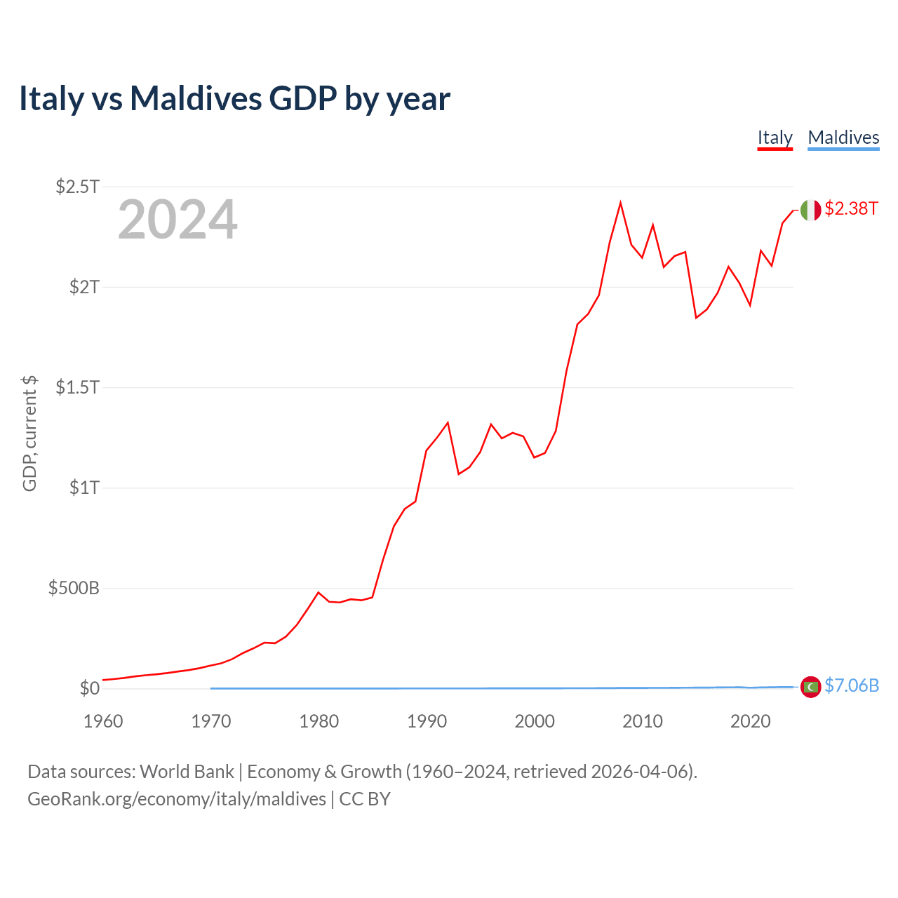 Italy has a GDP of $2.38T compared to $7.06B for Maldives, ranking 8/197 and 159/197 by economy size, respectively.