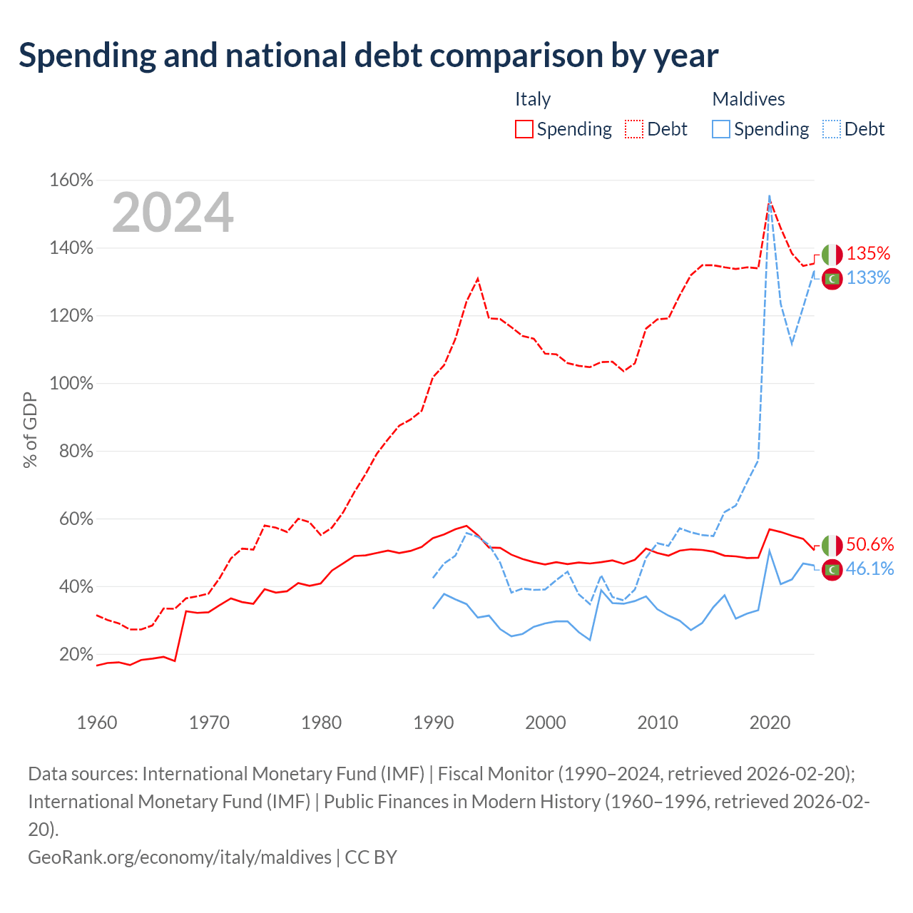 Italy has $3.22T in government debt (135.3% of GDP), compared to $9.41B (133.3% of GDP) in Maldives.