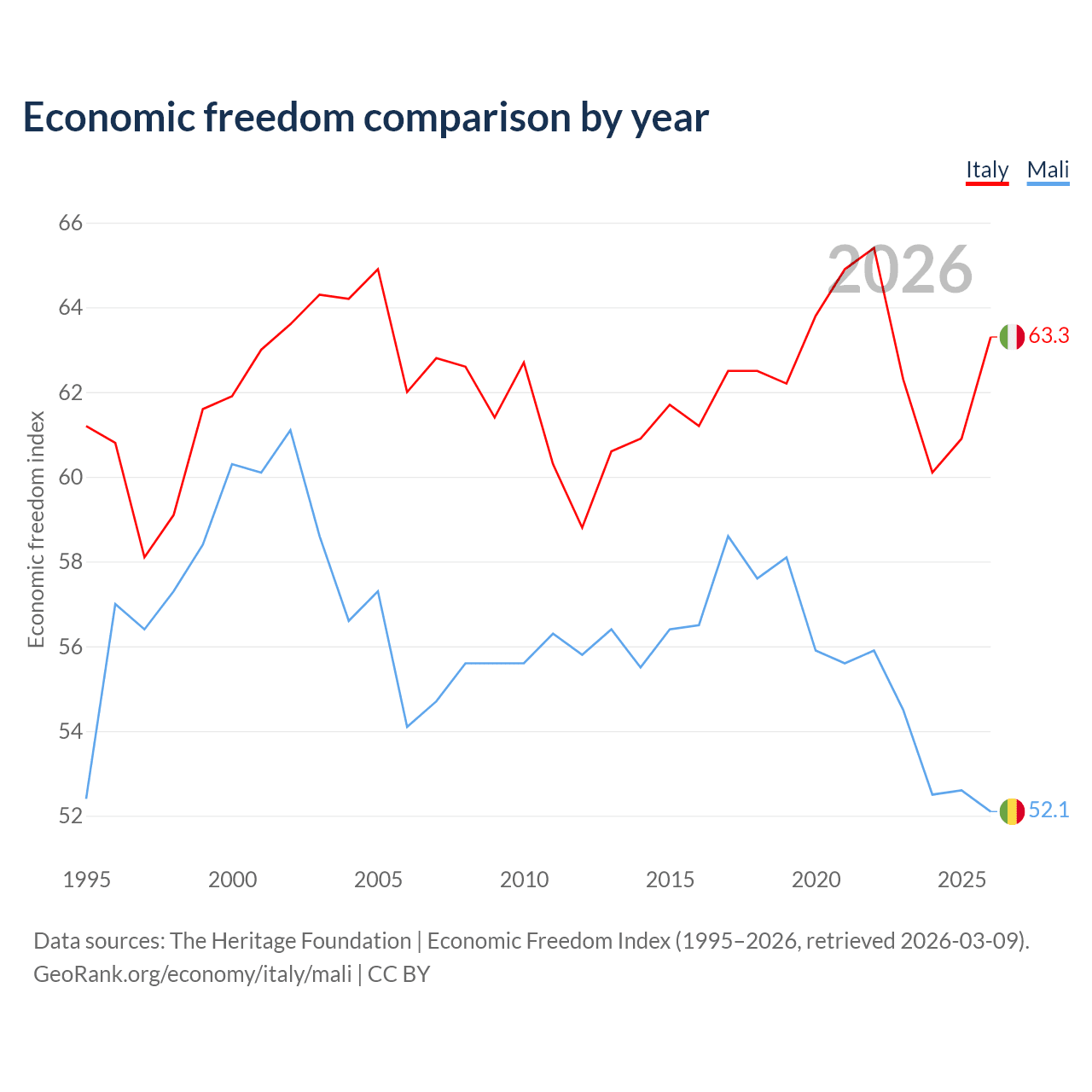 The Economic Freedom Index for Italy is 63.3, ranking 80/197, compared to 52.1 for Mali, ranking 150/197. The chart above displays a comparison of annual changes in economic freedom indexes.