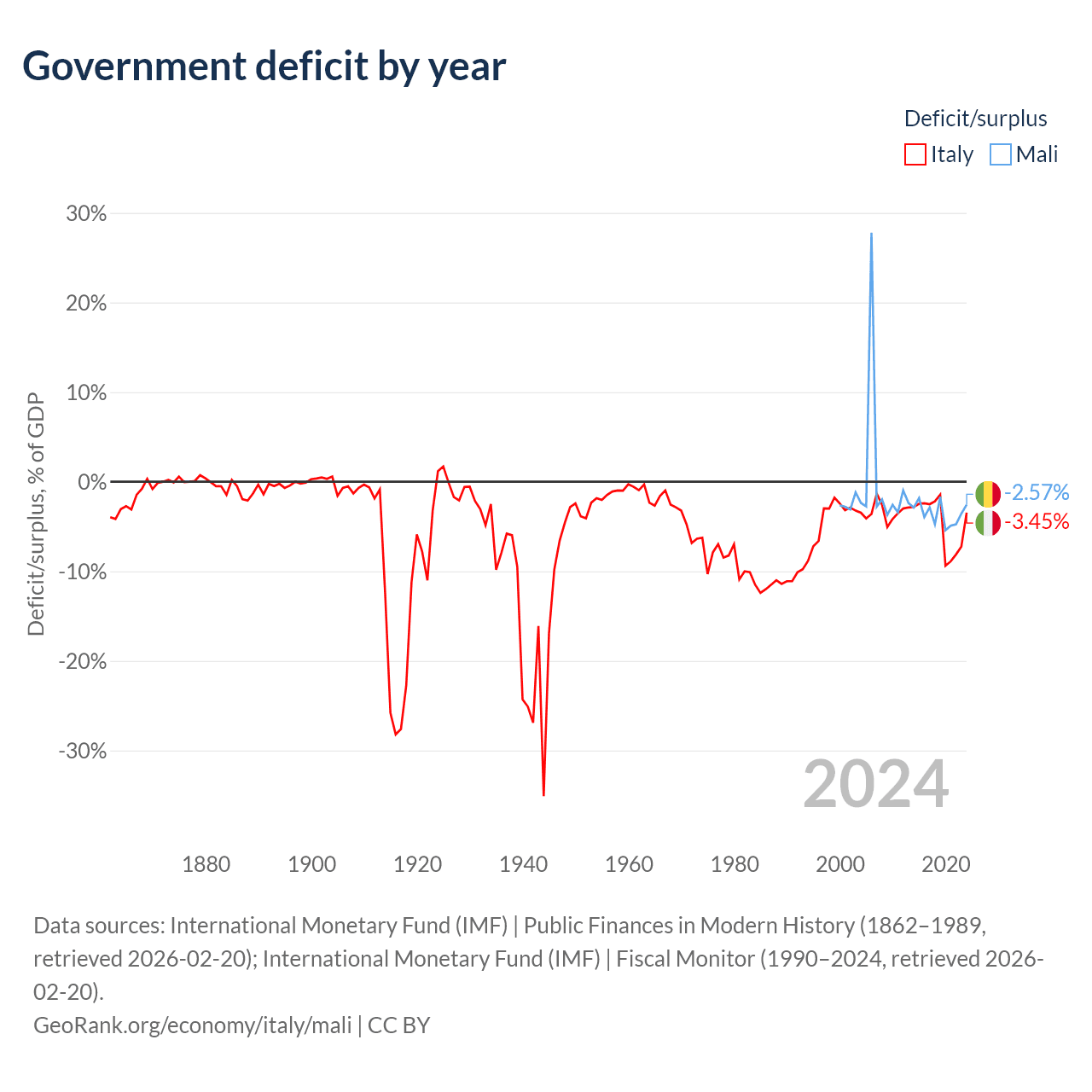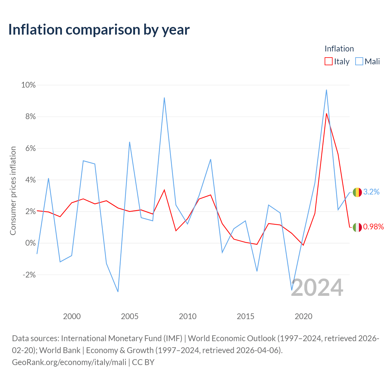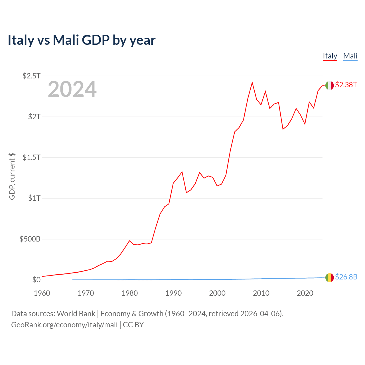 Italy has a GDP of $2.38T compared to $26.8B for Mali, ranking 8/197 and 113/197 by economy size, respectively.