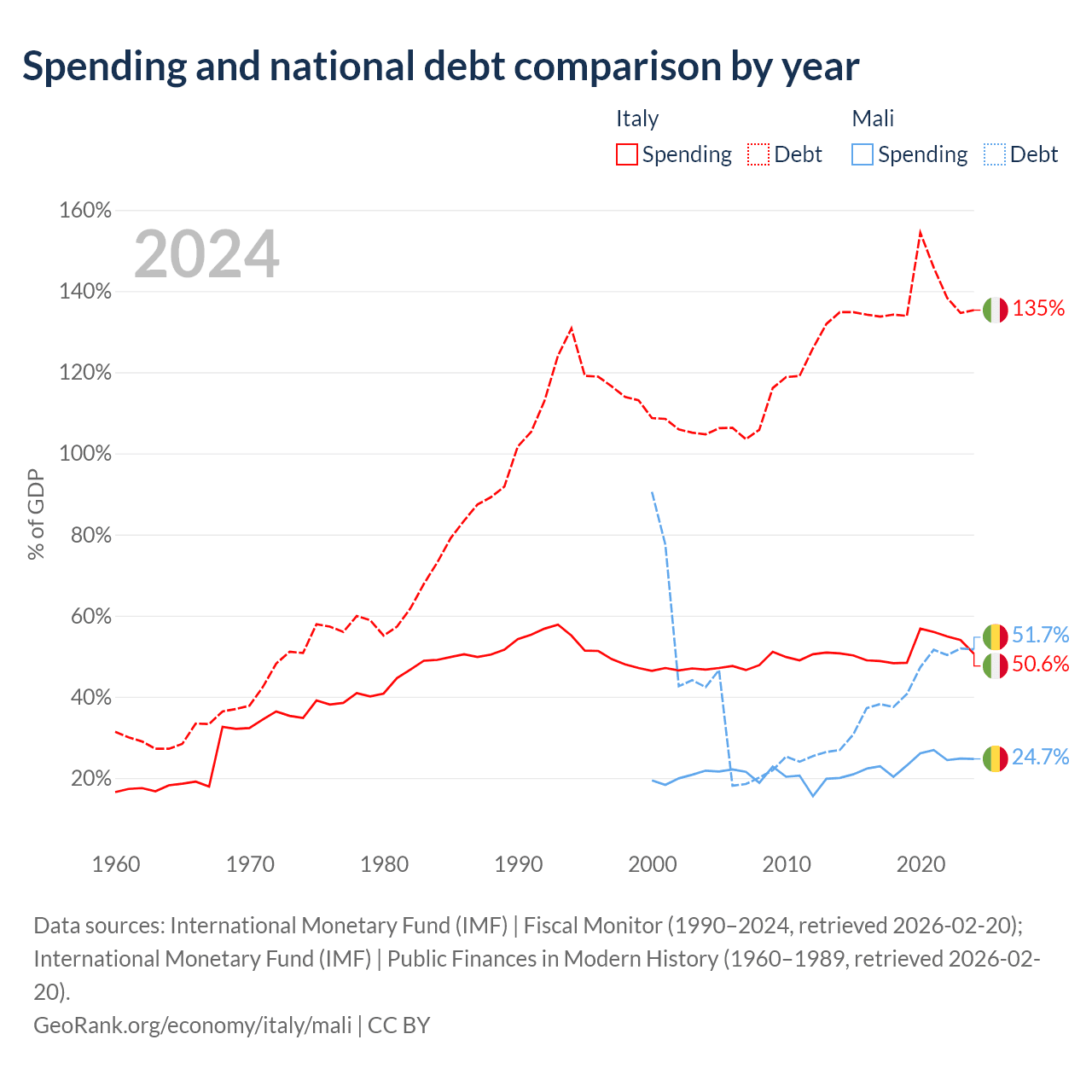 Italy has $3.22T in government debt (135.3% of GDP), compared to $13.9B (51.7% of GDP) in Mali.