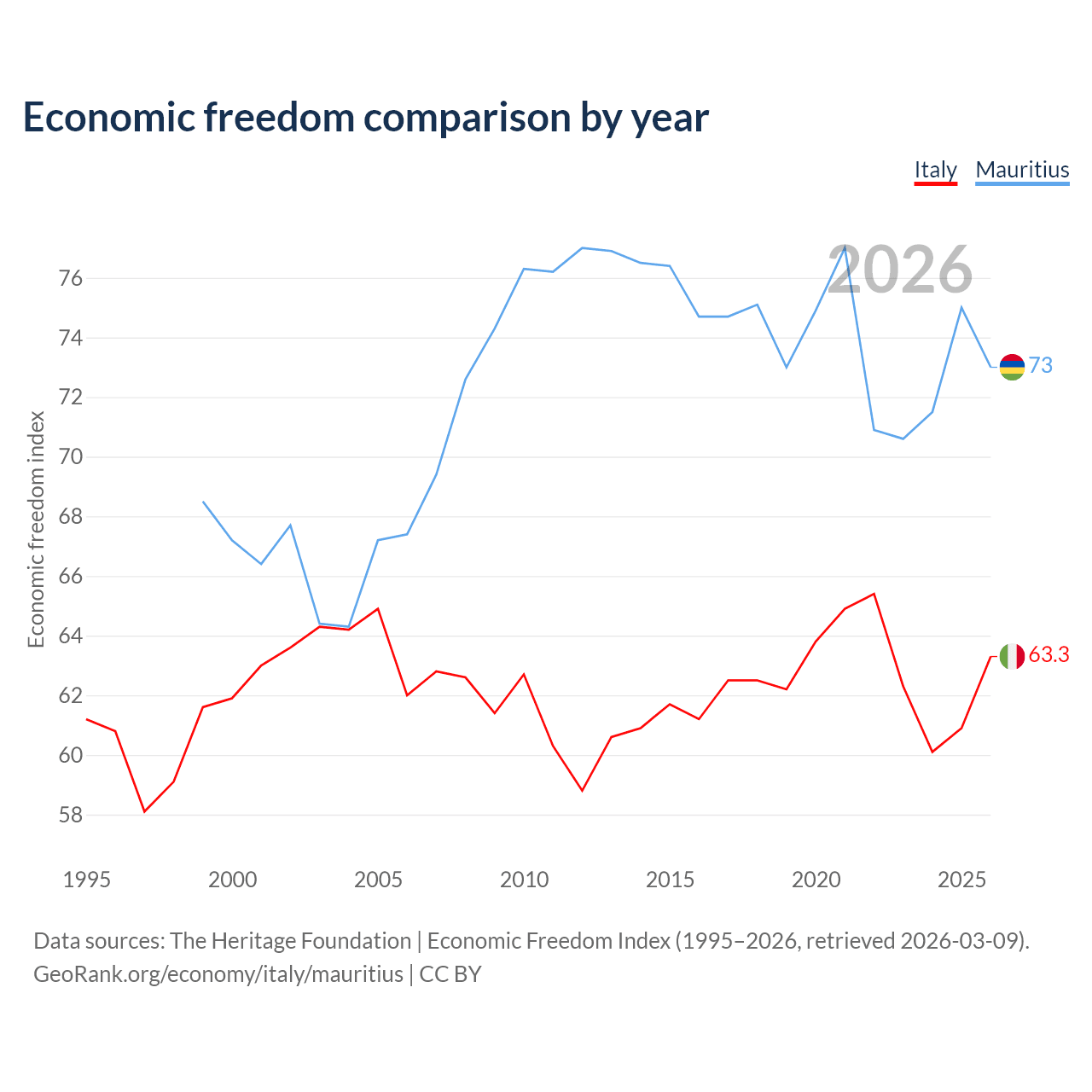 The Economic Freedom Index for Italy is 63.3, ranking 80/197, compared to 73 for Mauritius, ranking 26/197. The chart above displays a comparison of annual changes in economic freedom indexes.