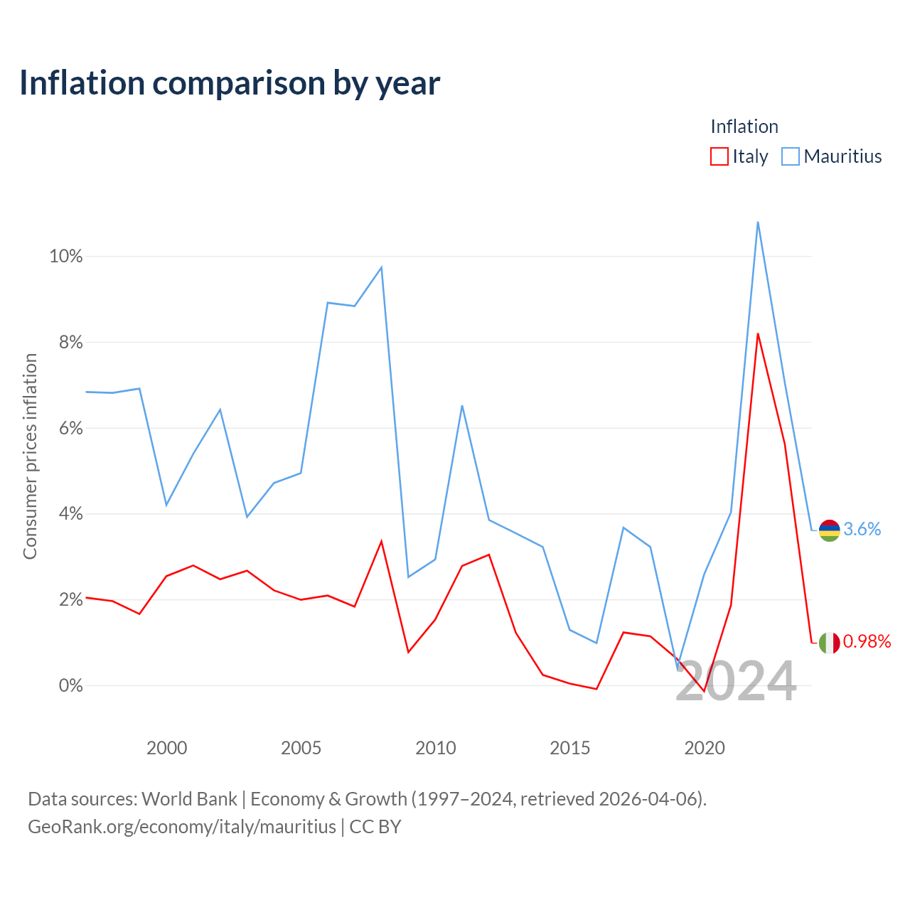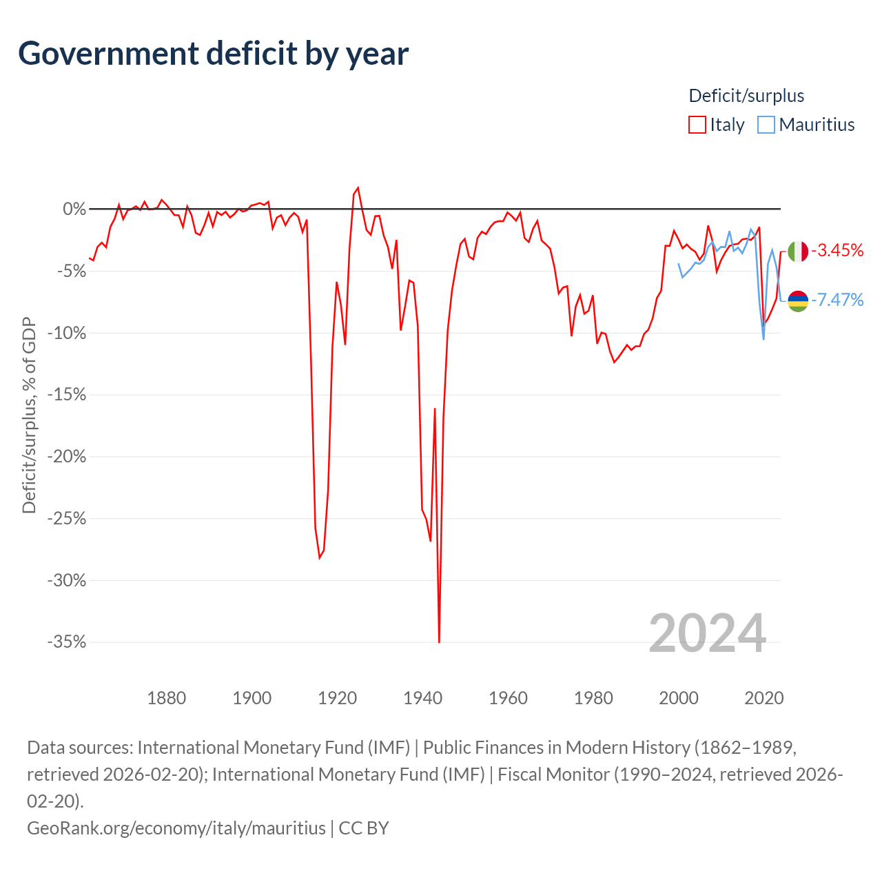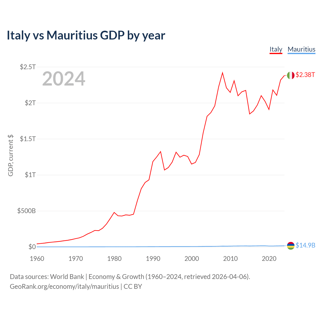 Italy has a GDP of $2.38T compared to $14.9B for Mauritius, ranking 8/197 and 143/197 by economy size, respectively.