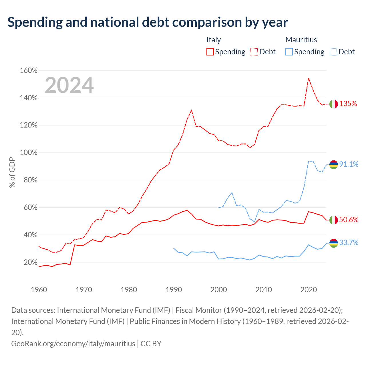 Italy has $3.22T in government debt (135.3% of GDP), compared to $13.6B (91.1% of GDP) in Mauritius.