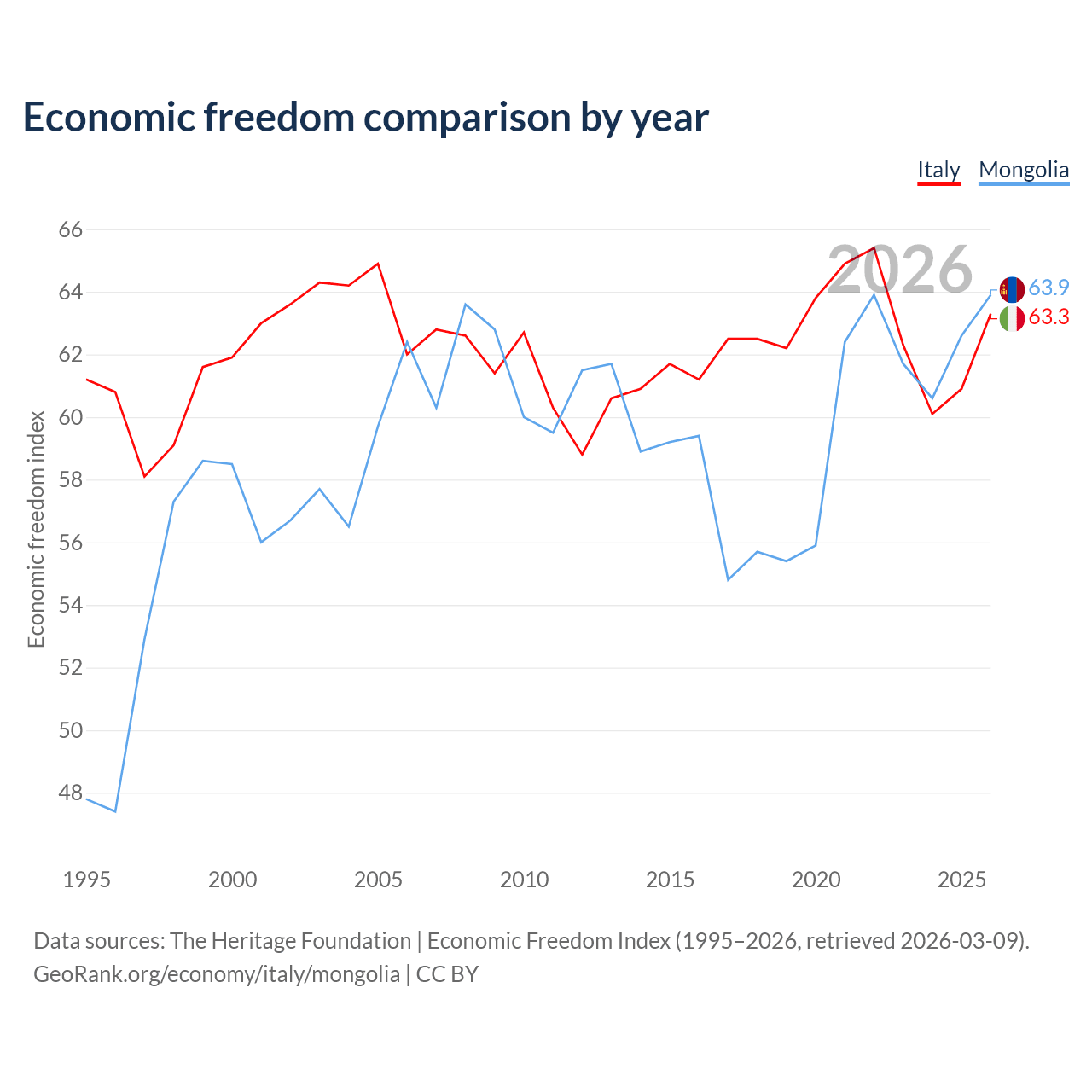 The Economic Freedom Index for Italy is 63.3, ranking 80/197, compared to 63.9 for Mongolia, ranking 76/197. The chart above displays a comparison of annual changes in economic freedom indexes.