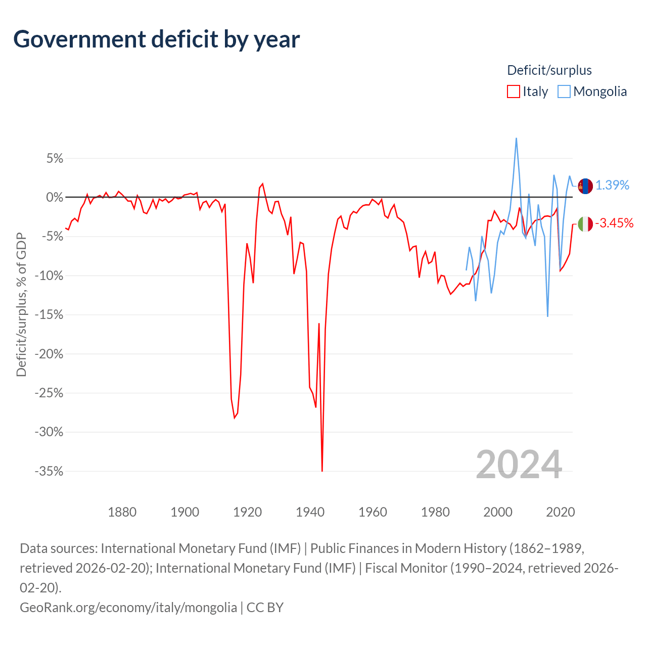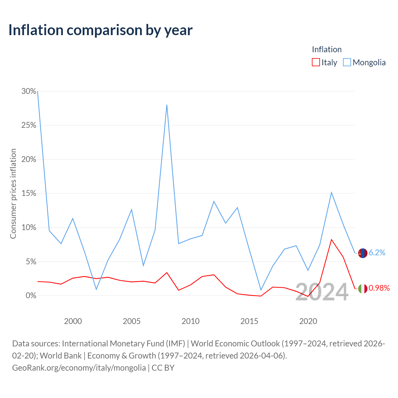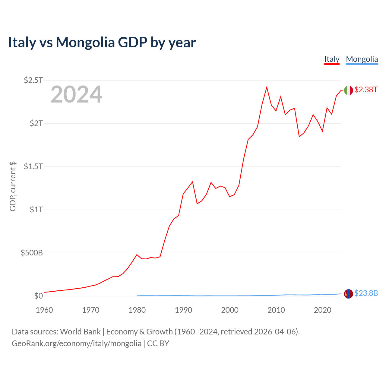 Italy has a GDP of $2.38T compared to $23.8B for Mongolia, ranking 8/197 and 121/197 by economy size, respectively.