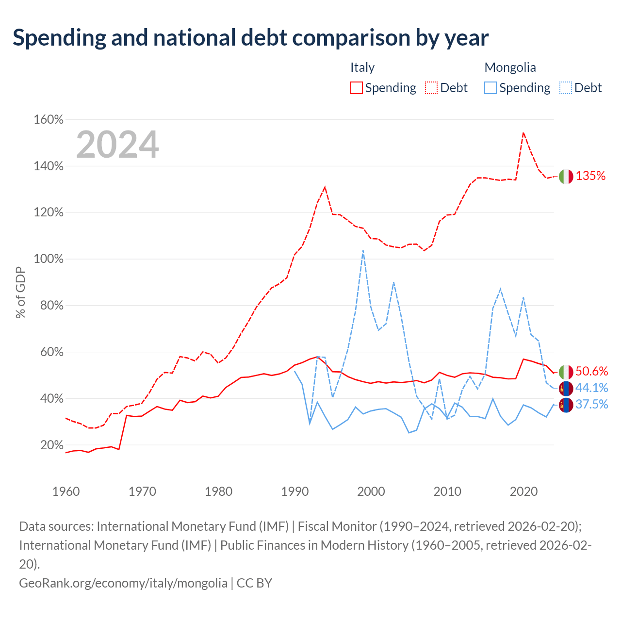 Italy has $3.22T in government debt (135.3% of GDP), compared to $10.5B (44.1% of GDP) in Mongolia.