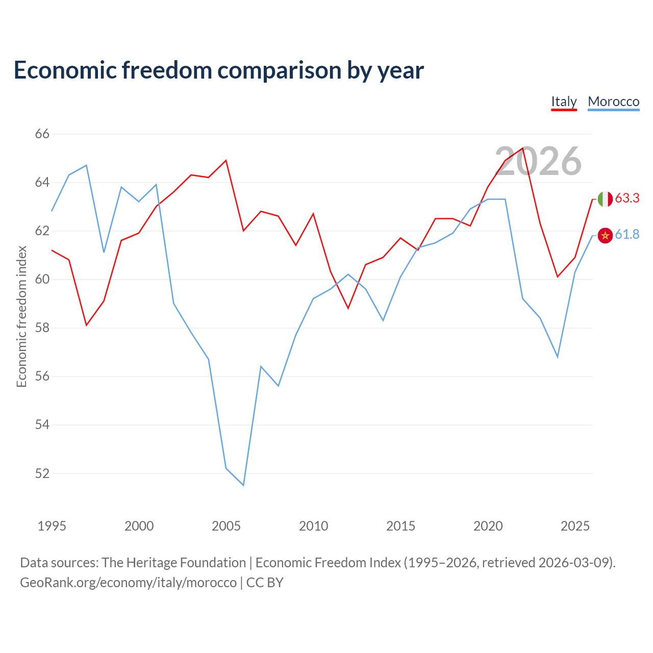 The Economic Freedom Index for Italy is 63.3, ranking 80/197, compared to 61.8 for Morocco, ranking 91/197. The chart above displays a comparison of annual changes in economic freedom indexes.