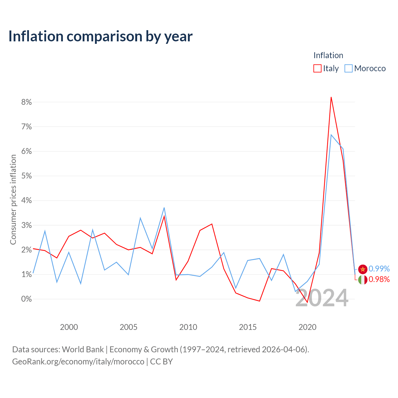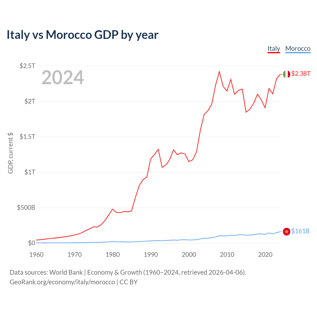 Italy has a GDP of $2.38T compared to $161B for Morocco, ranking 8/197 and 58/197 by economy size, respectively.