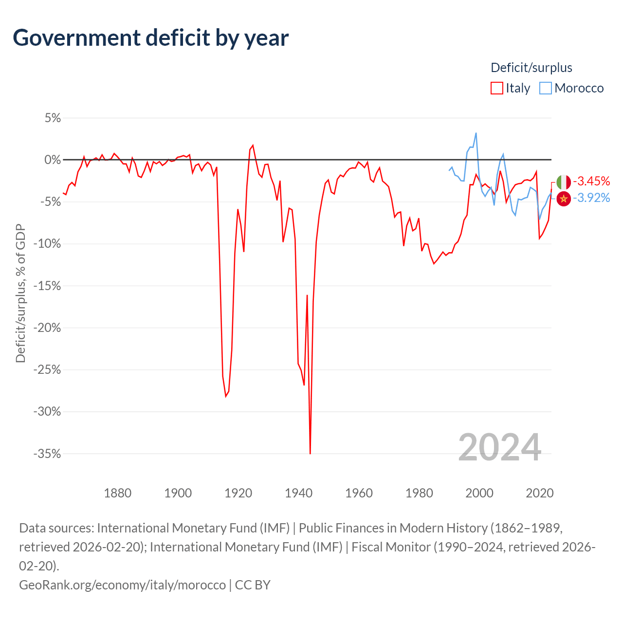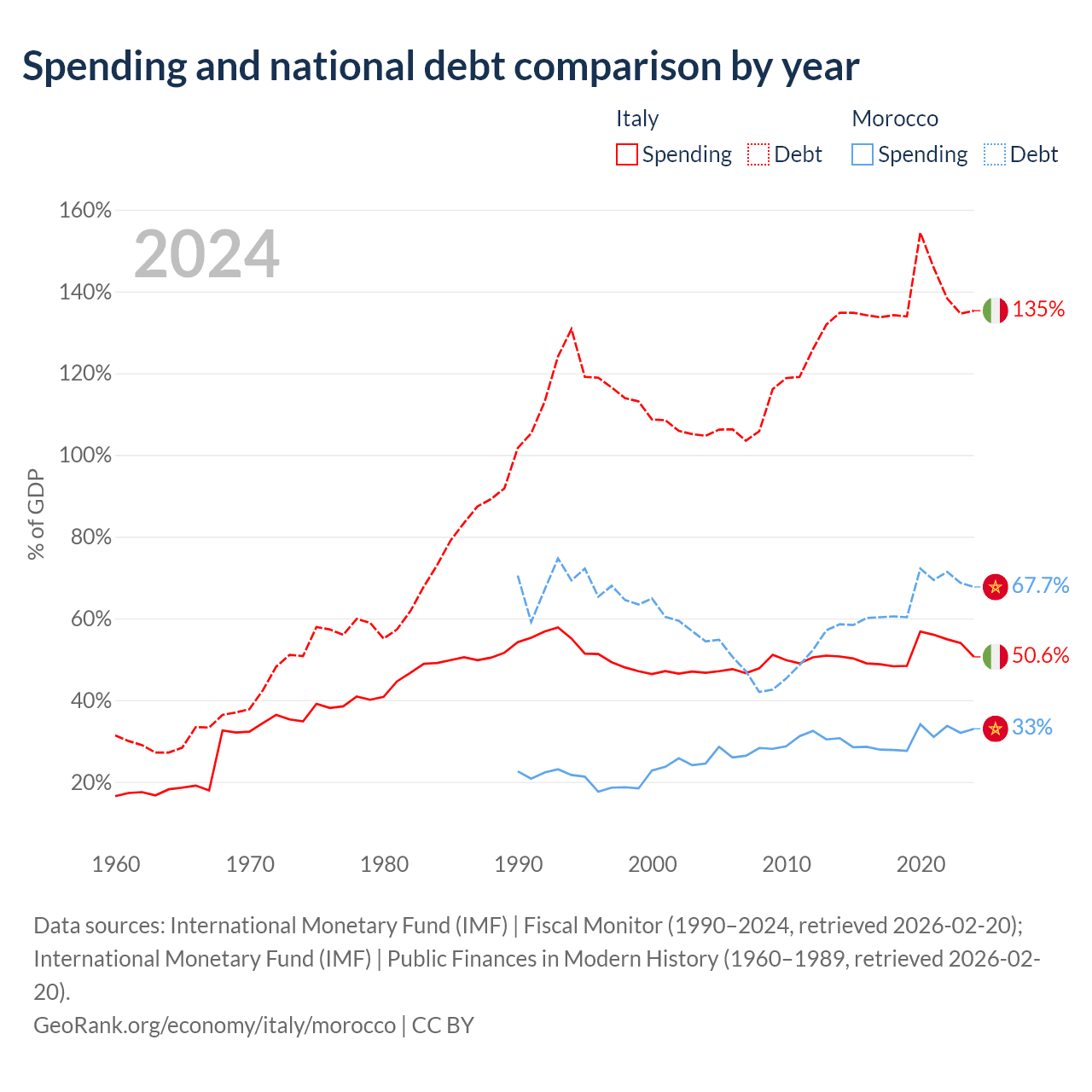 Italy has $3.22T in government debt (135.3% of GDP), compared to $109B (67.7% of GDP) in Morocco.