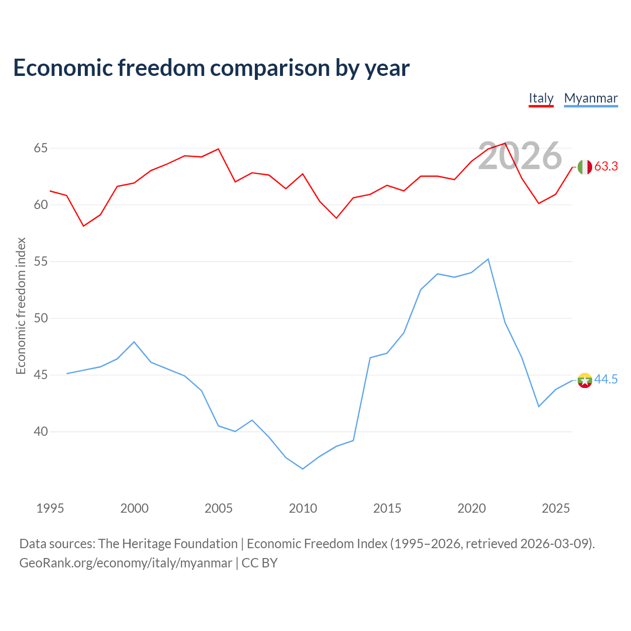 The Economic Freedom Index for Italy is 63.3, ranking 80/197, compared to 44.5 for Myanmar, ranking 180/197. The chart above displays a comparison of annual changes in economic freedom indexes.