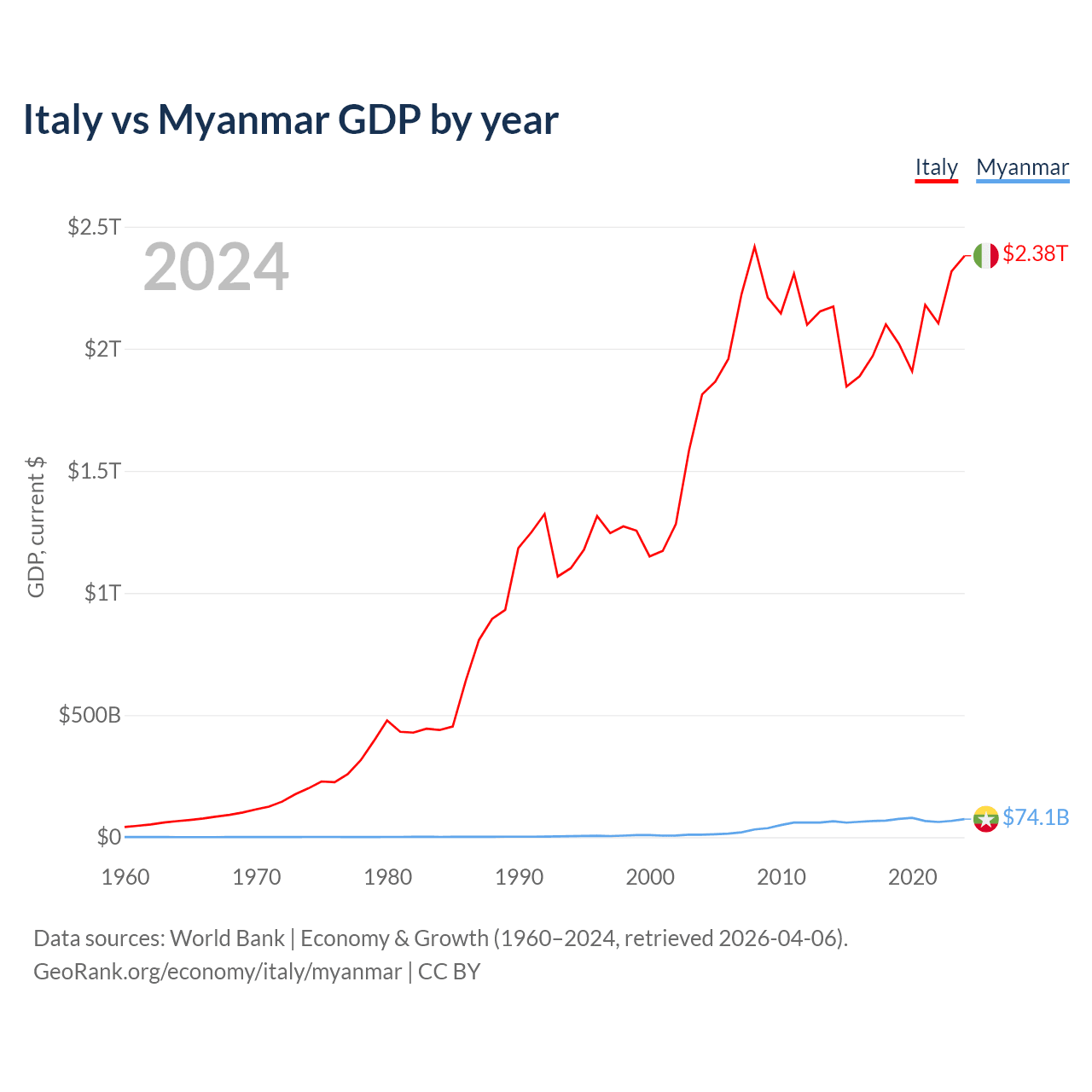 Italy has a GDP of $2.38T compared to $74.1B for Myanmar, ranking 8/197 and 85/197 by economy size, respectively.