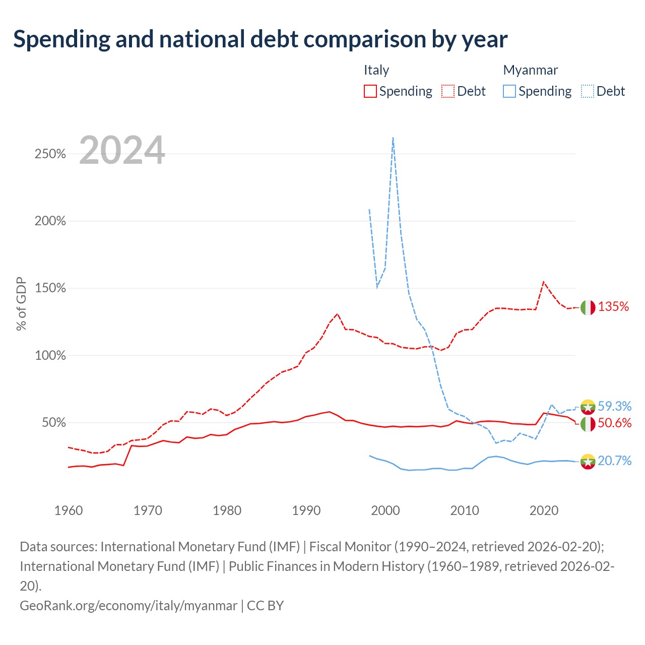 Italy has $3.22T in government debt (135.3% of GDP), compared to $44B (59.3% of GDP) in Myanmar.