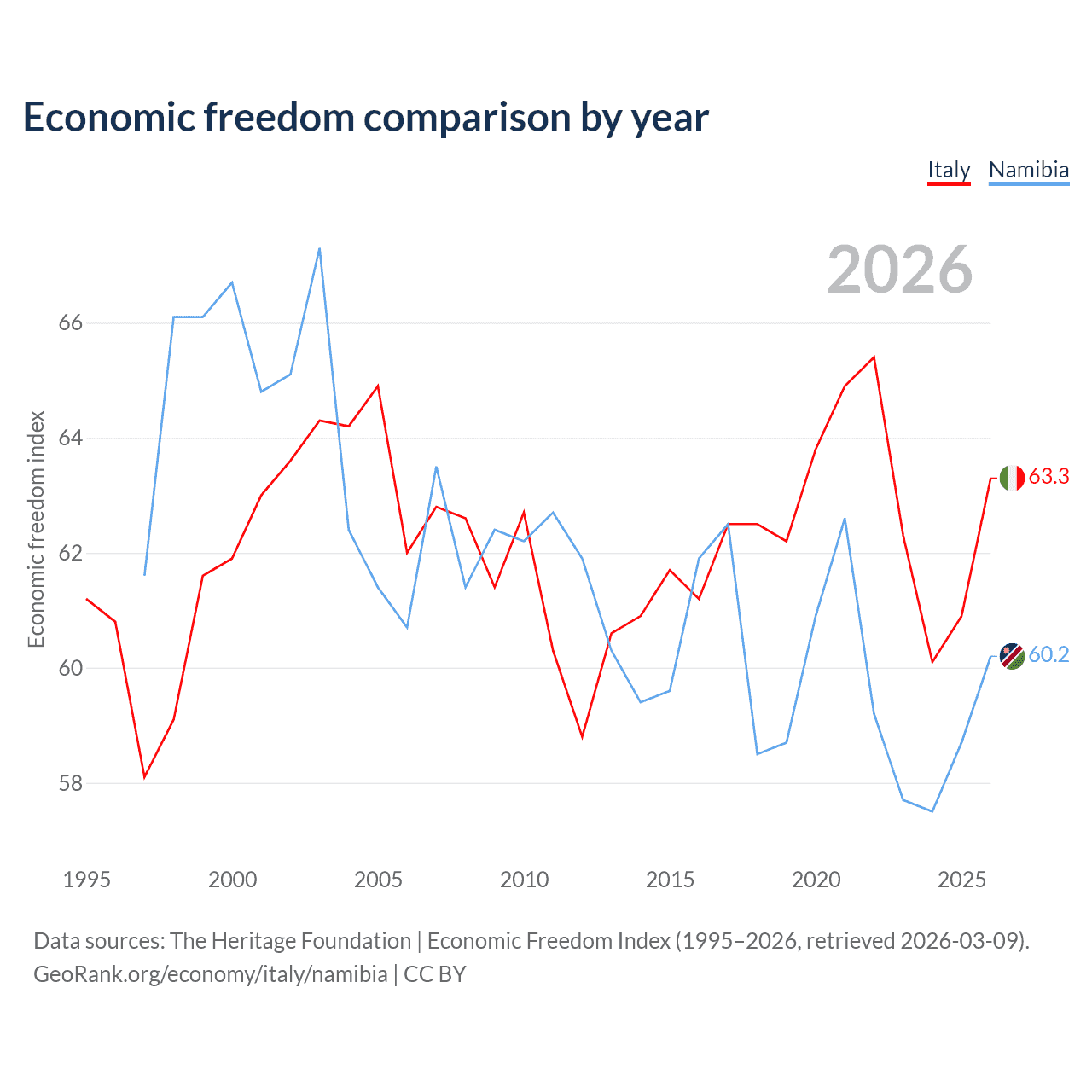 The Economic Freedom Index for Italy is 63.3, ranking 80/197, compared to 60.2 for Namibia, ranking 95/197. The chart above displays a comparison of annual changes in economic freedom indexes.