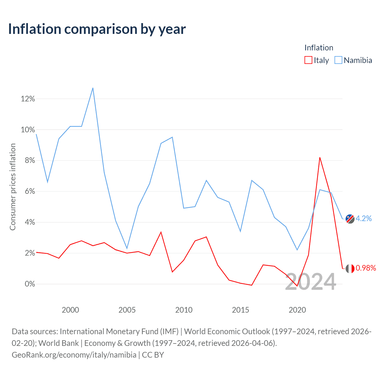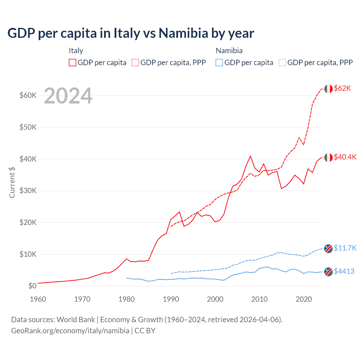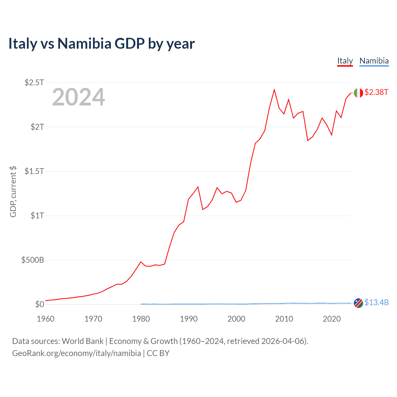 Italy has a GDP of $2.38T compared to $13.4B for Namibia, ranking 8/197 and 147/197 by economy size, respectively.
