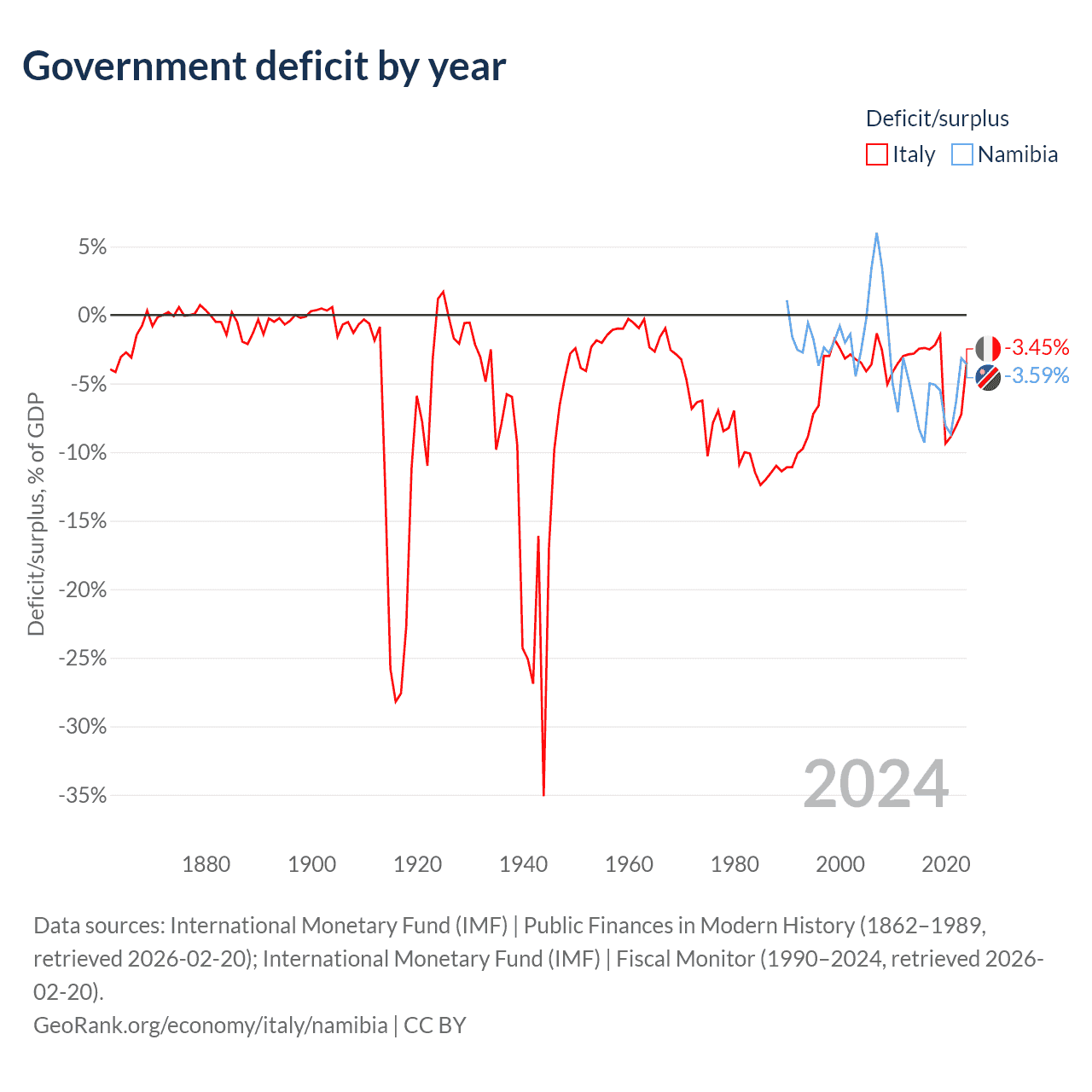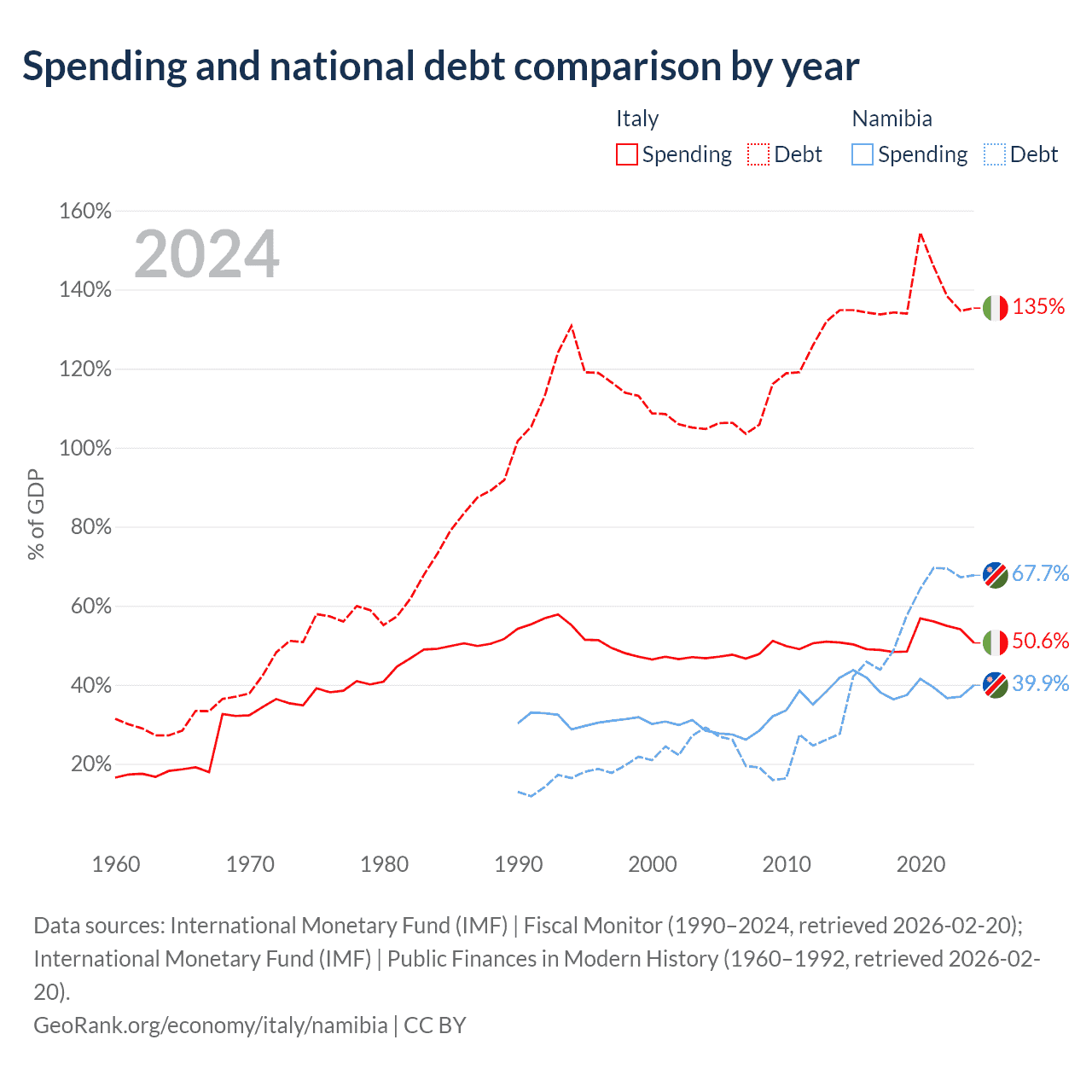 Italy has $3.22T in government debt (135.3% of GDP), compared to $9.05B (67.7% of GDP) in Namibia.
