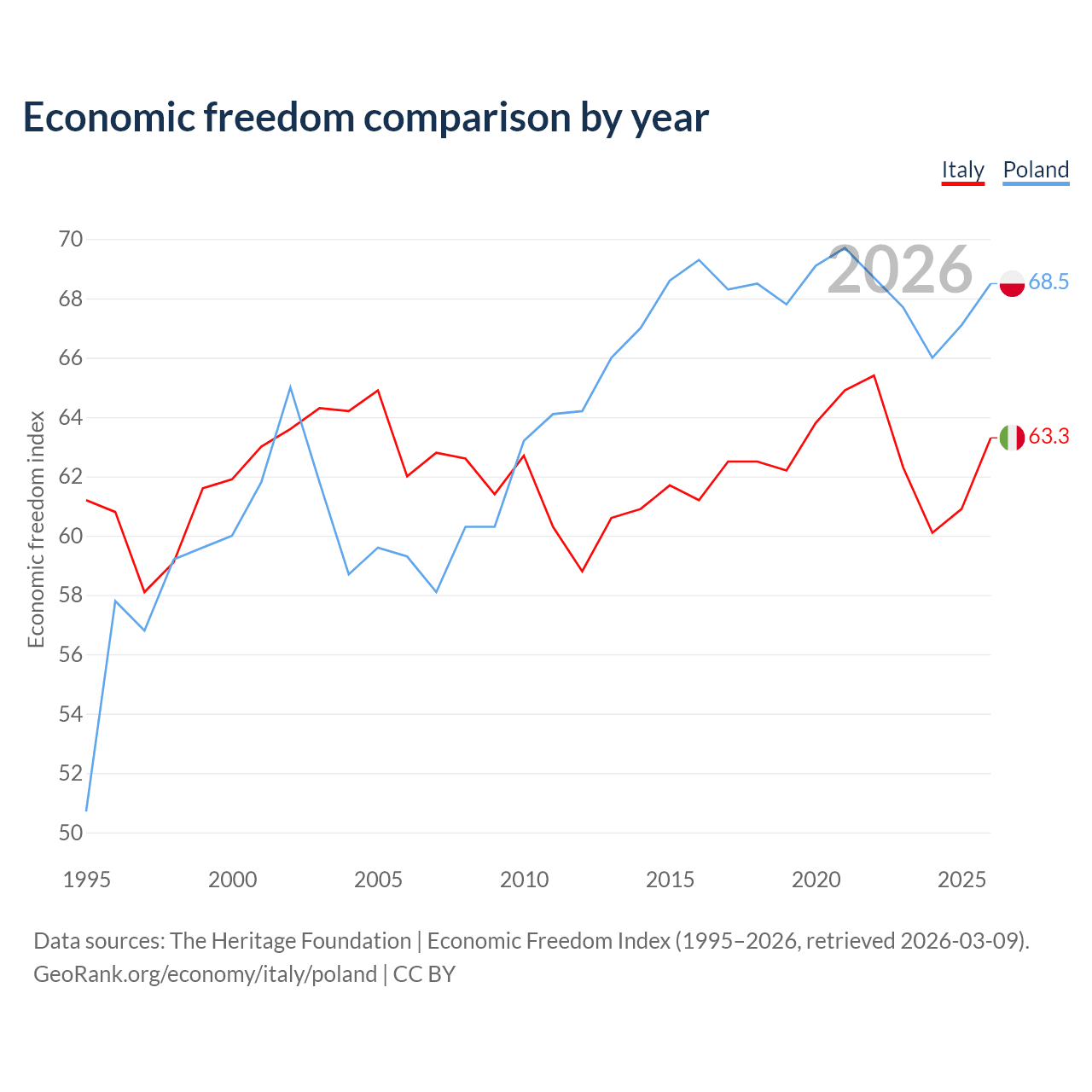 Data sources: The Heritage Foundation | Economic Freedom Index (1995–2026, retrieved 2026-03-09).