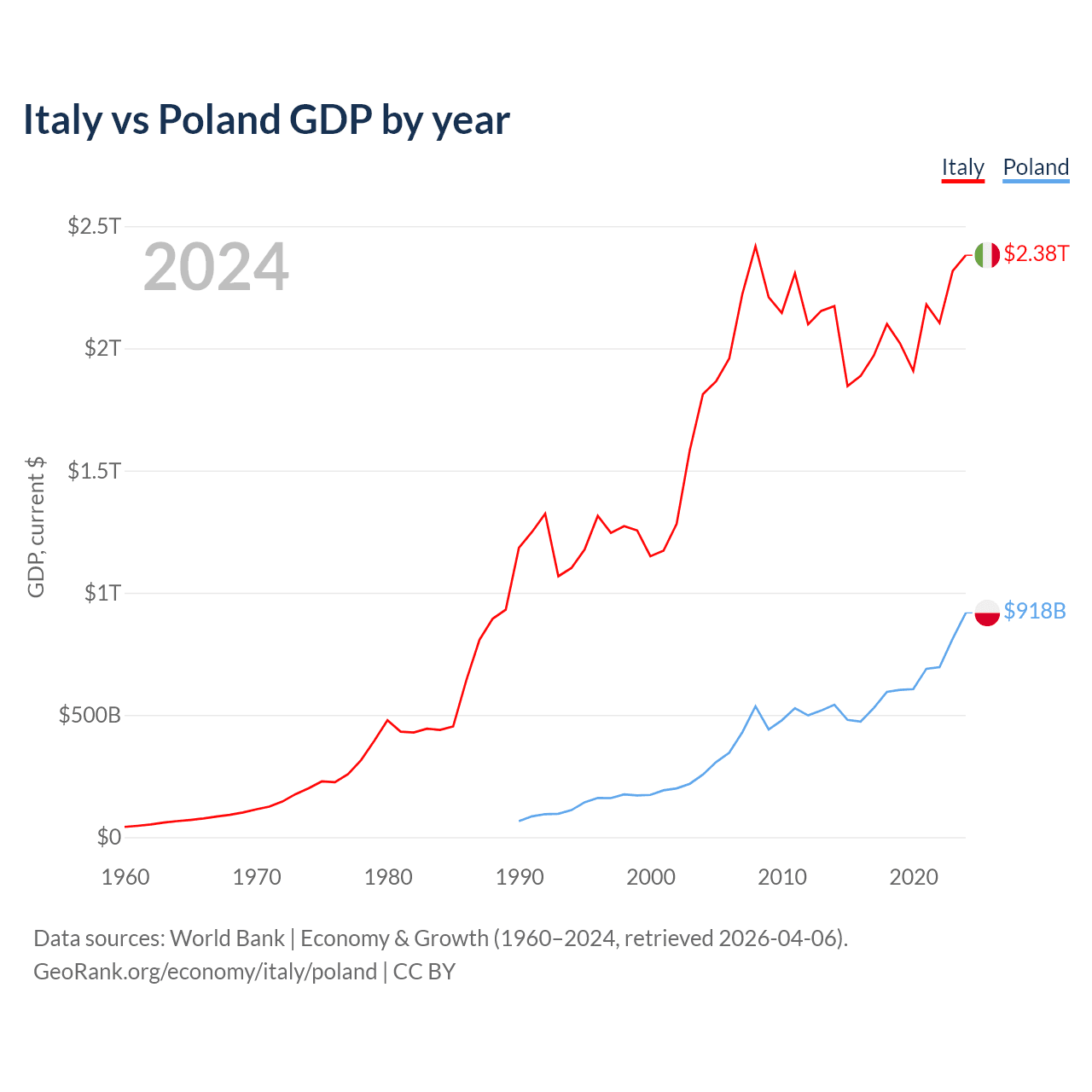 Italy has a GDP of $2.38T compared to $918B for Poland, ranking 8/197 and 21/197 by economy size, respectively.