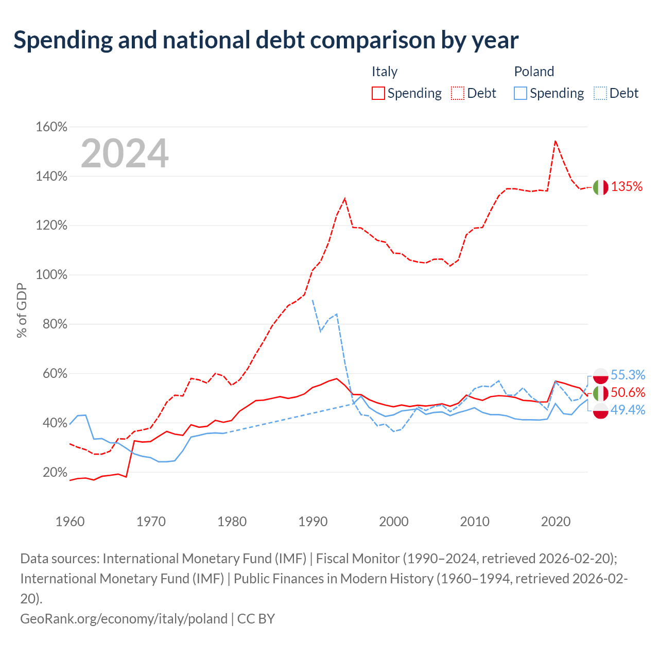 Italy has $3.22T in government debt (135.3% of GDP), compared to $507B (55.3% of GDP) in Poland.