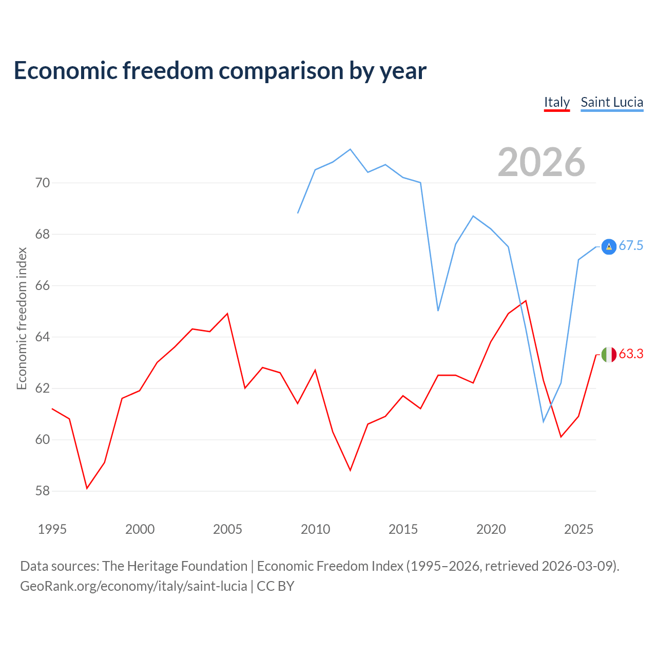 The Economic Freedom Index for Italy is 63.3, ranking 80/197, compared to 67.5 for Saint Lucia, ranking 57/197. The chart above displays a comparison of annual changes in economic freedom indexes.