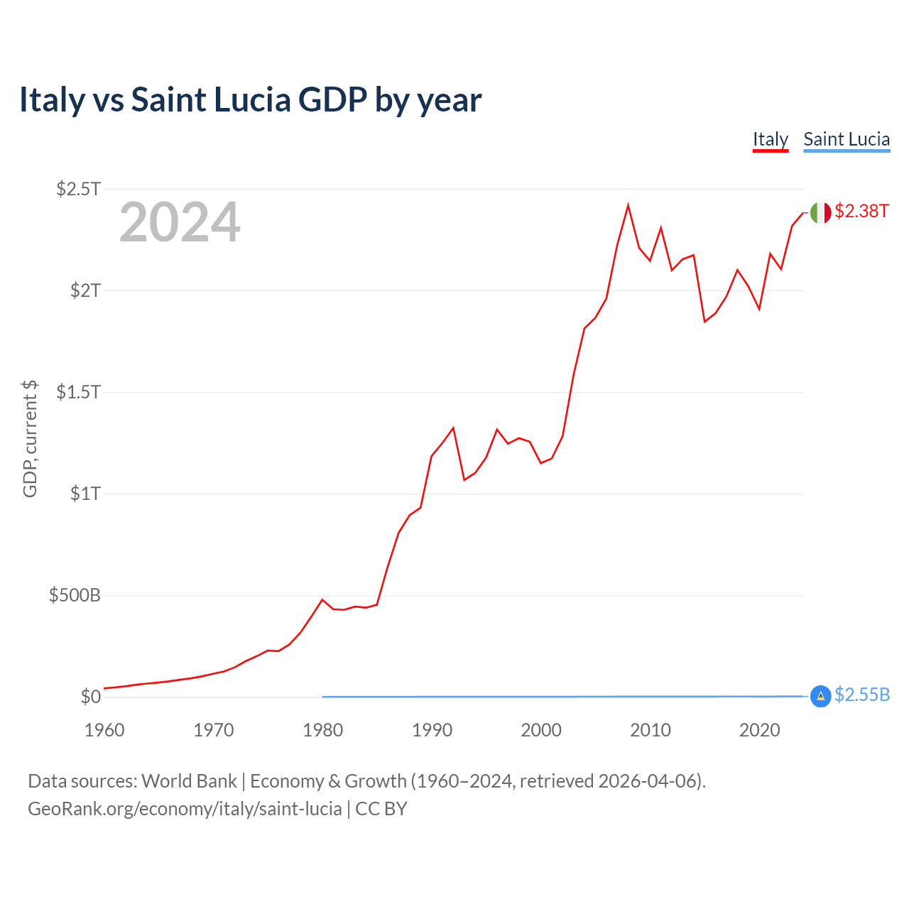 Italy has a GDP of $2.38T compared to $2.55B for Saint Lucia, ranking 8/197 and 173/197 by economy size, respectively.
