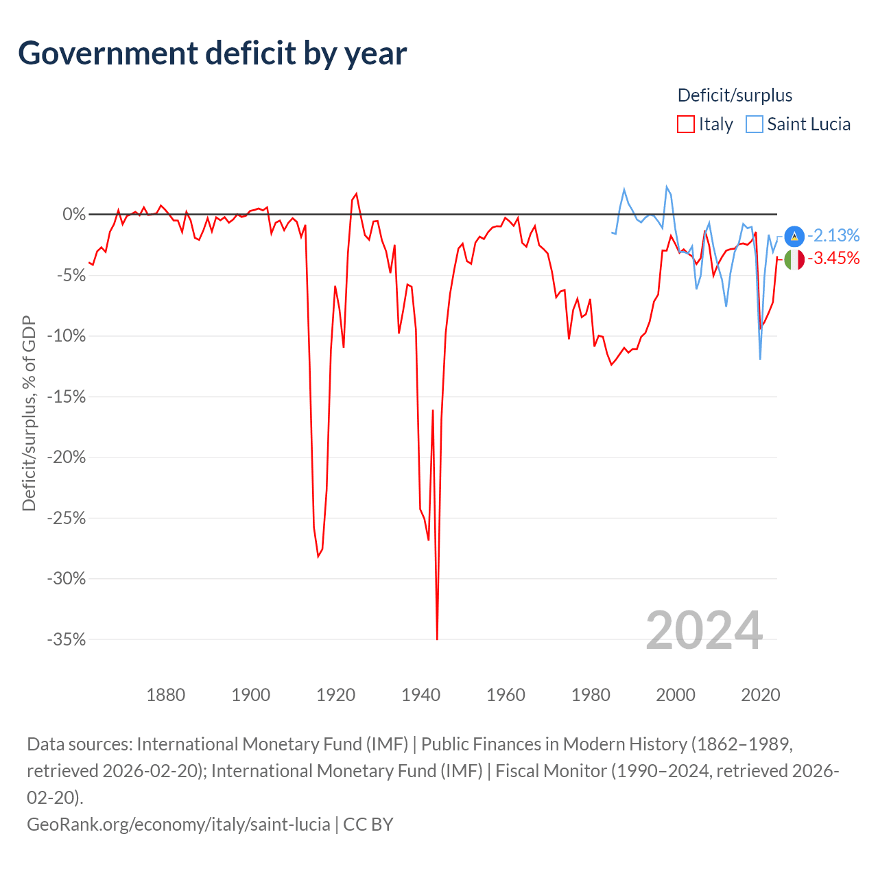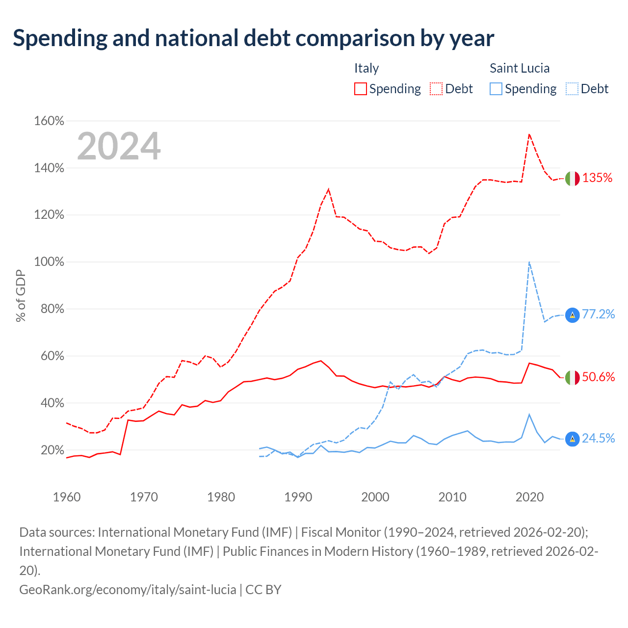 Italy has $3.22T in government debt (135.3% of GDP), compared to $1.97B (77.2% of GDP) in Saint Lucia.