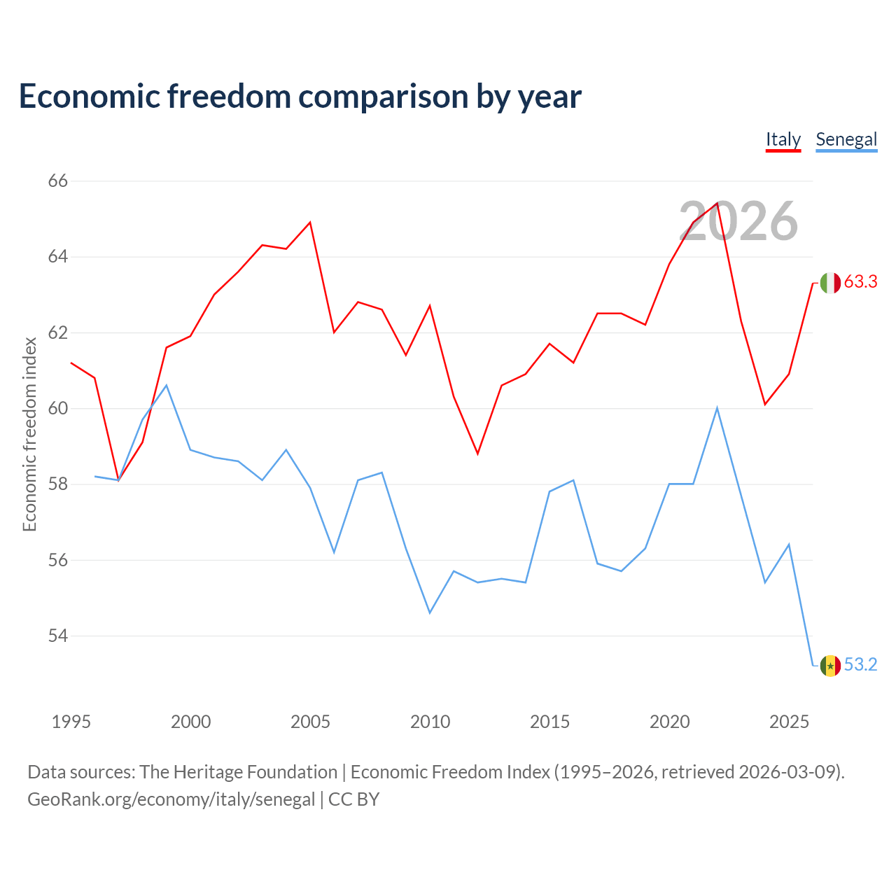 The Economic Freedom Index for Italy is 63.3, ranking 80/197, compared to 53.2 for Senegal, ranking 140/197. The chart above displays a comparison of annual changes in economic freedom indexes.