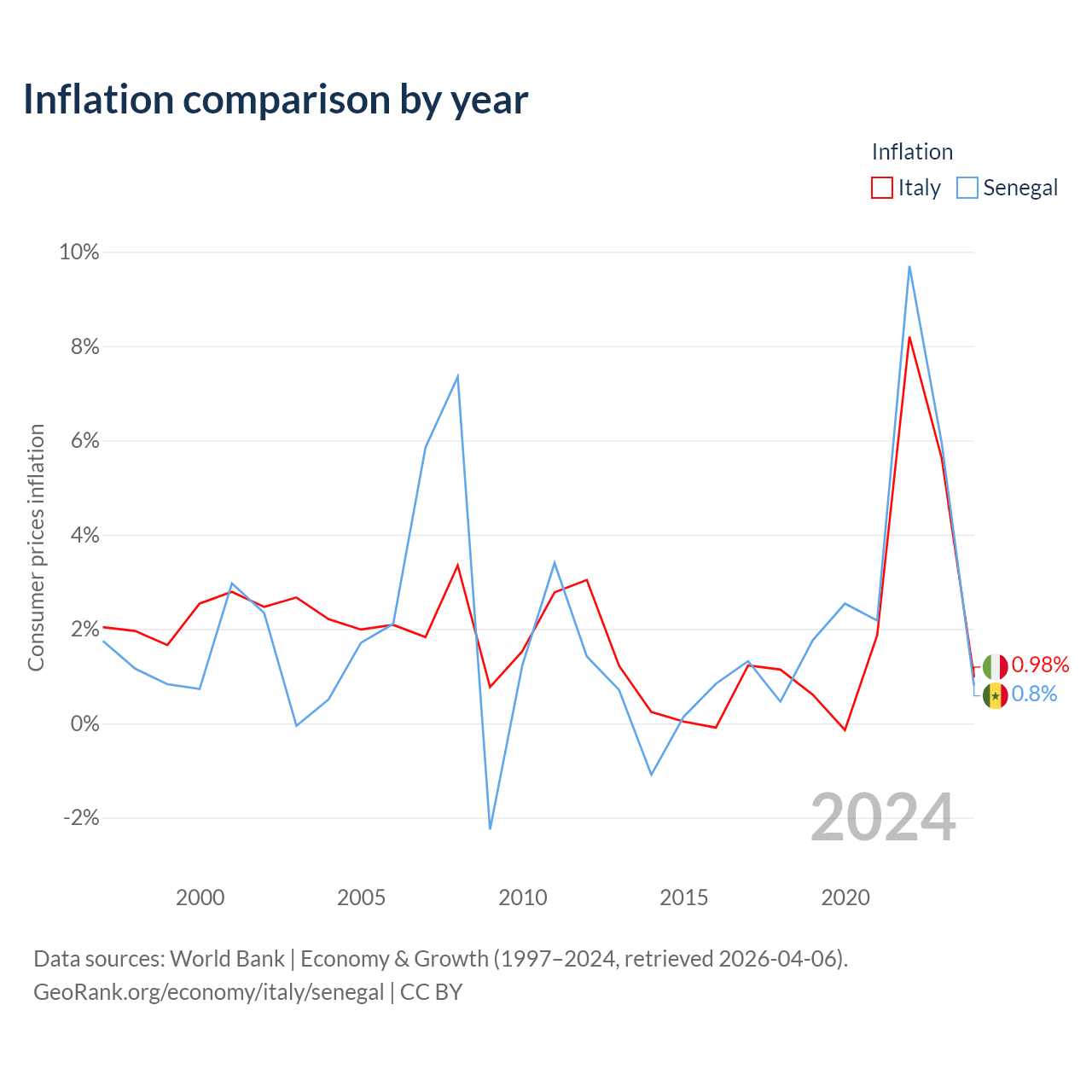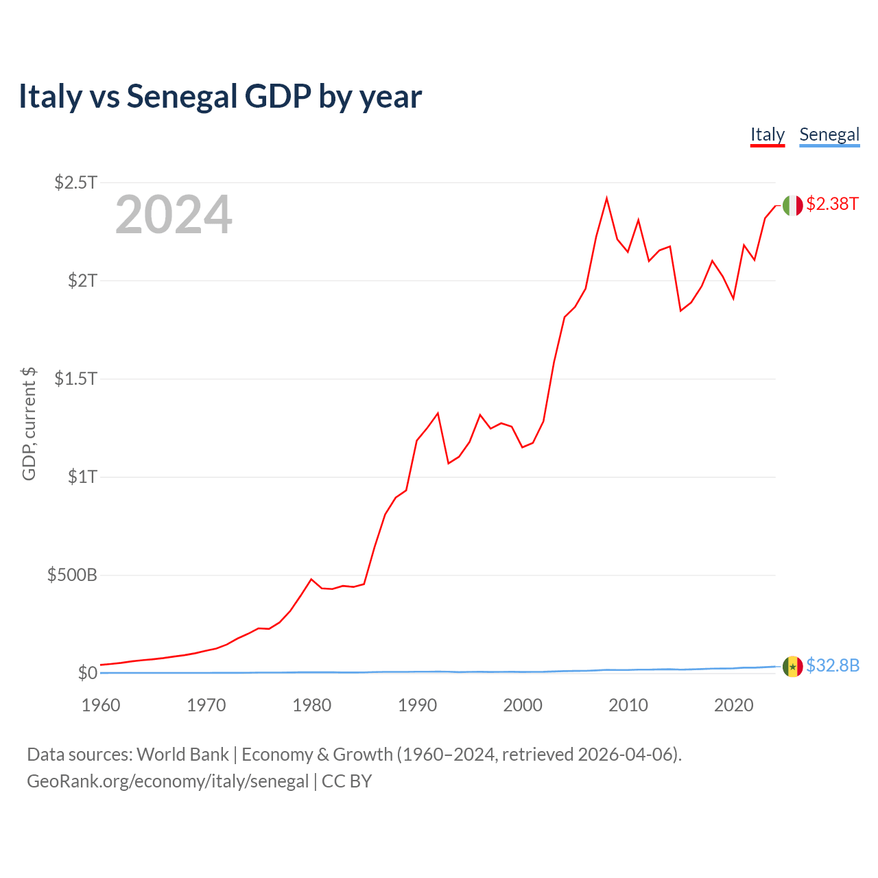 Italy has a GDP of $2.38T compared to $32.8B for Senegal, ranking 8/197 and 109/197 by economy size, respectively.