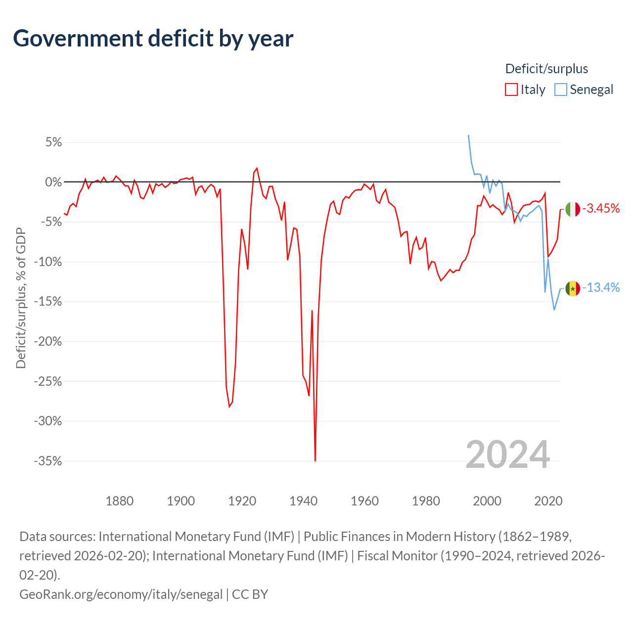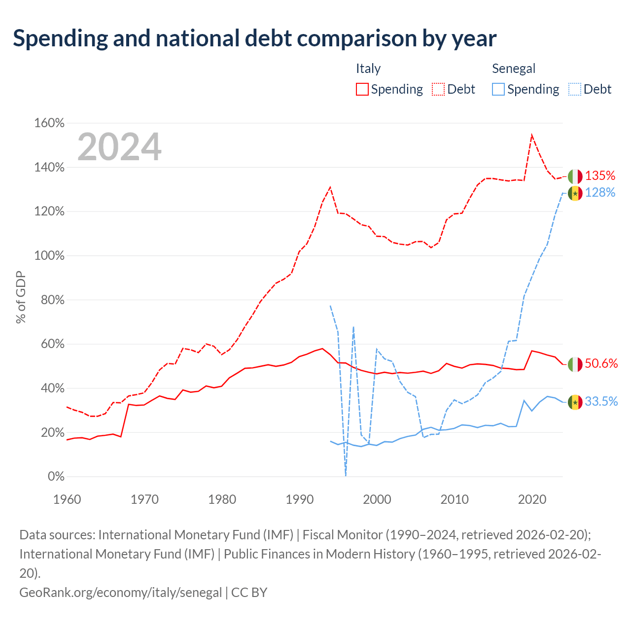 Italy has $3.22T in government debt (135.3% of GDP), compared to $42.1B (128.4% of GDP) in Senegal.
