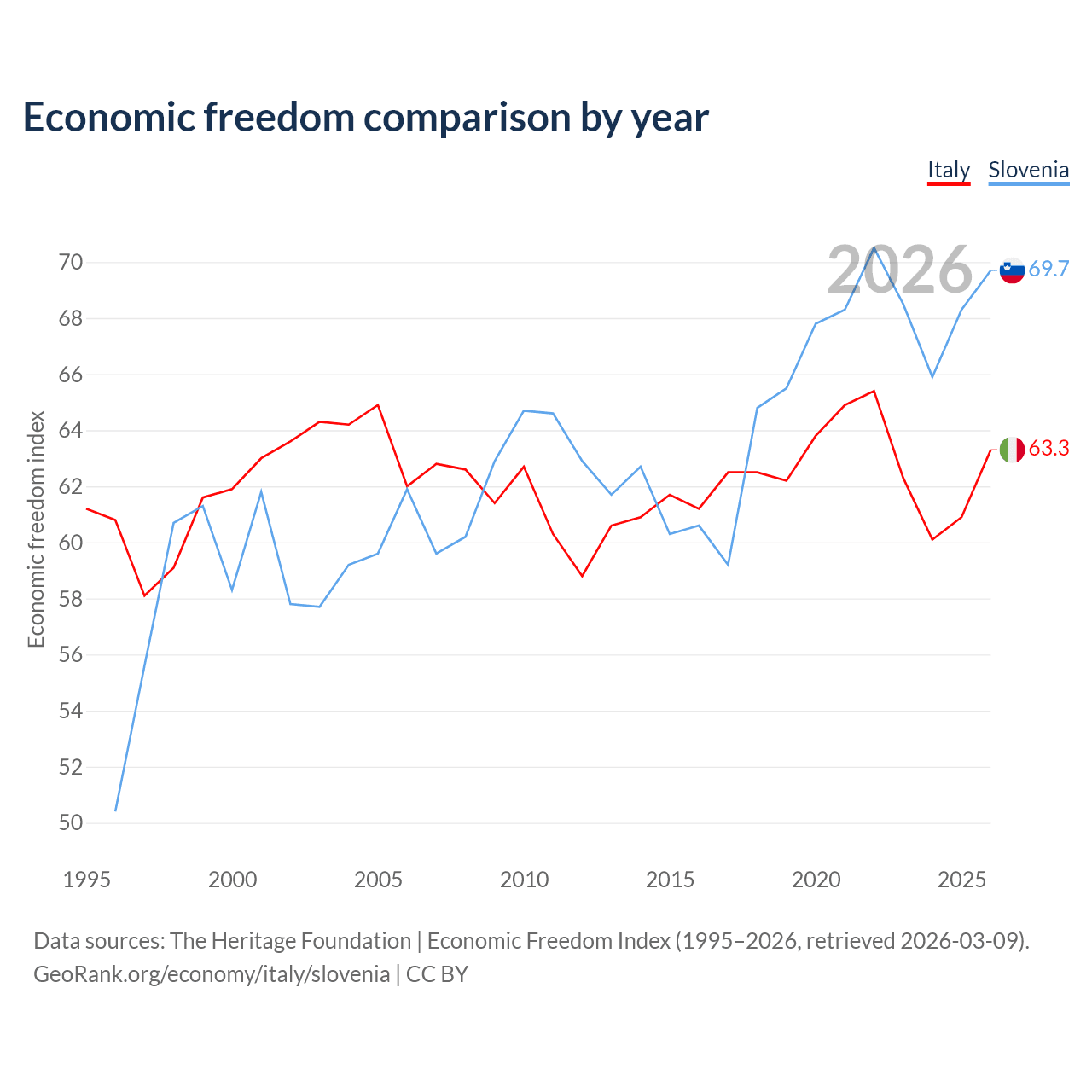 The Economic Freedom Index for Italy is 63.3, ranking 80/197, compared to 69.7 for Slovenia, ranking 40/197. The chart above displays a comparison of annual changes in economic freedom indexes.