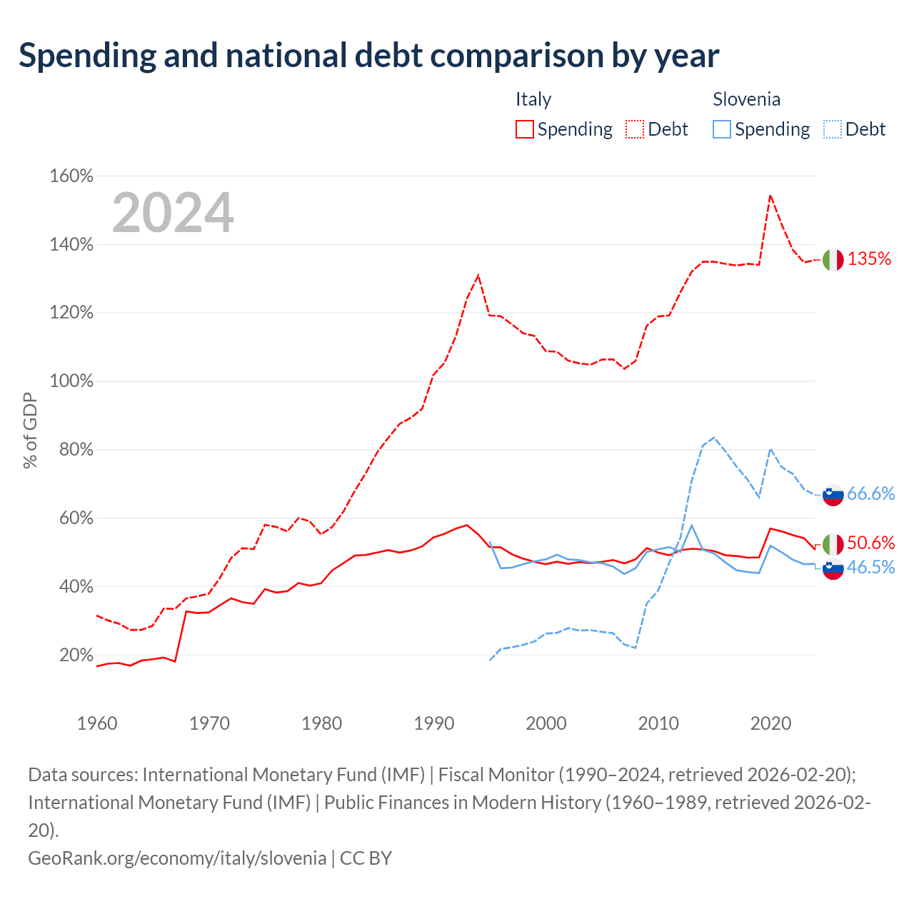 Italy has $3.22T in government debt (135.3% of GDP), compared to $48.6B (66.6% of GDP) in Slovenia.