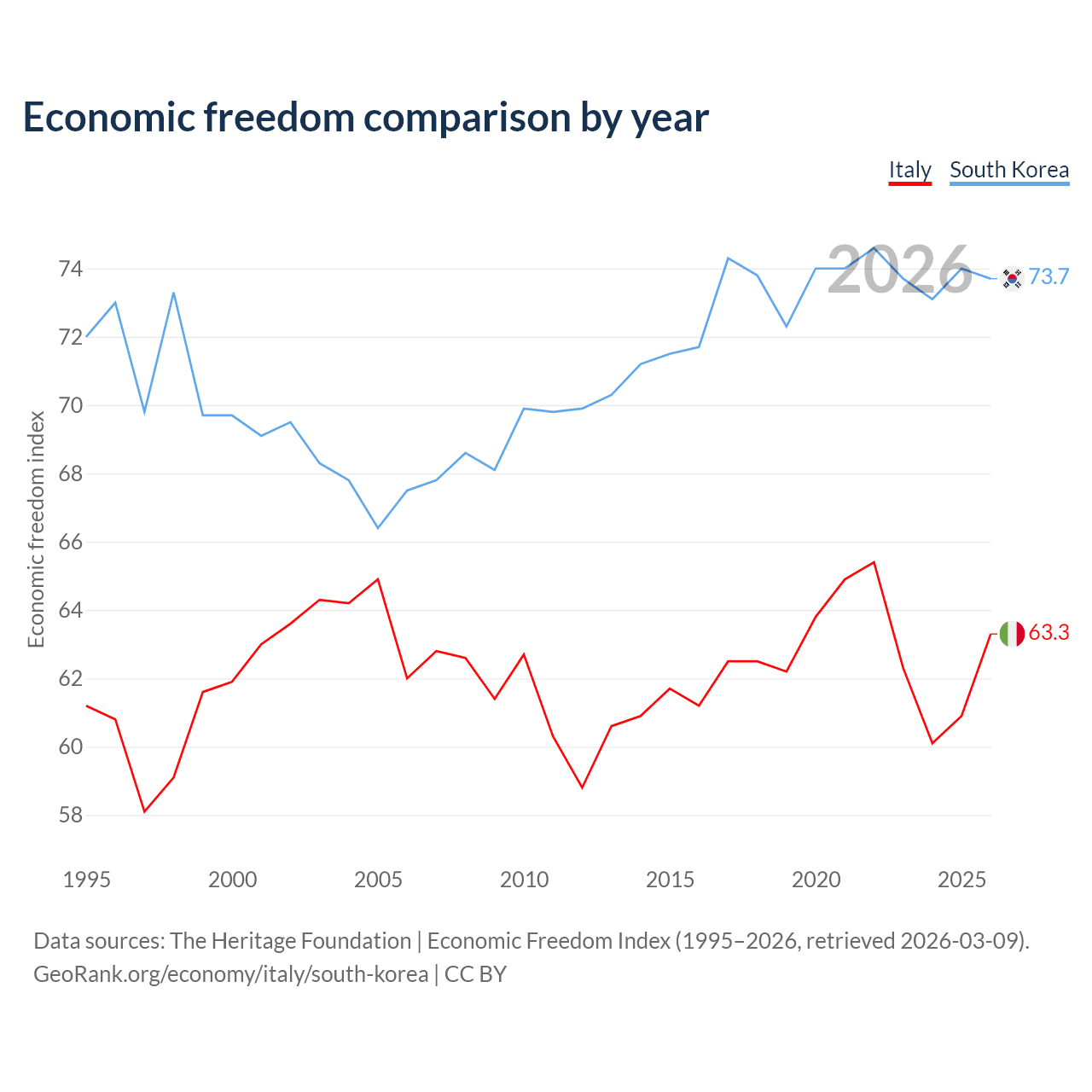 The Economic Freedom Index for Italy is 63.3, ranking 80/197, compared to 73.7 for South Korea, ranking 24/197. The chart above displays a comparison of annual changes in economic freedom indexes.