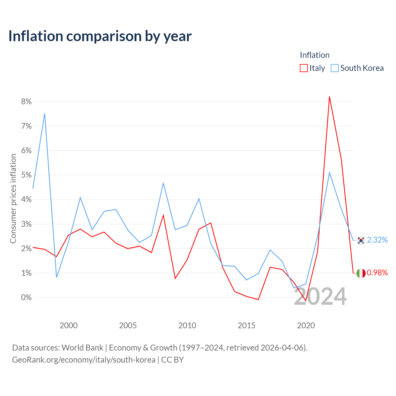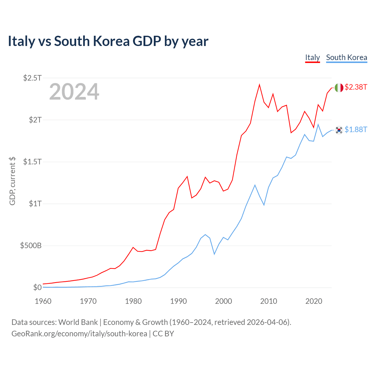 Italy has a GDP of $2.38T compared to $1.88T for South Korea, ranking 8/197 and 12/197 by economy size, respectively.