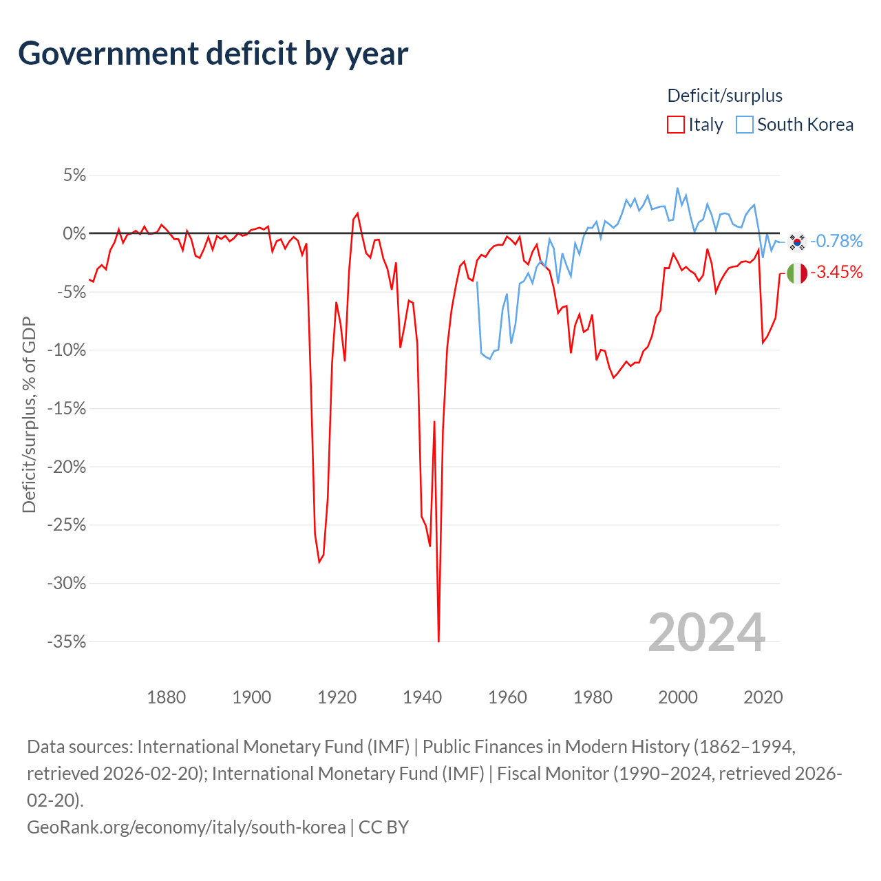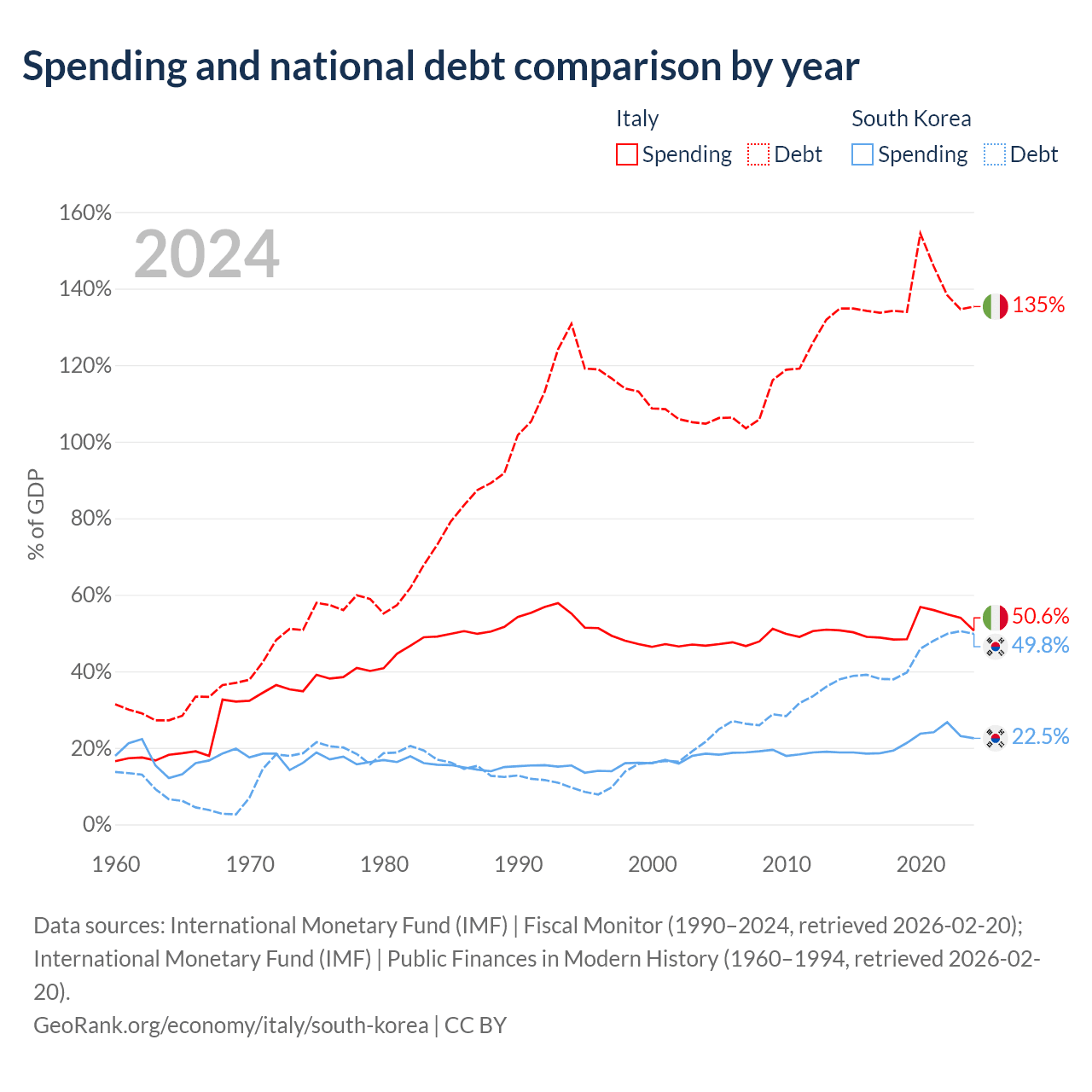 Italy has $3.22T in government debt (135.3% of GDP), compared to $934B (49.8% of GDP) in South Korea.