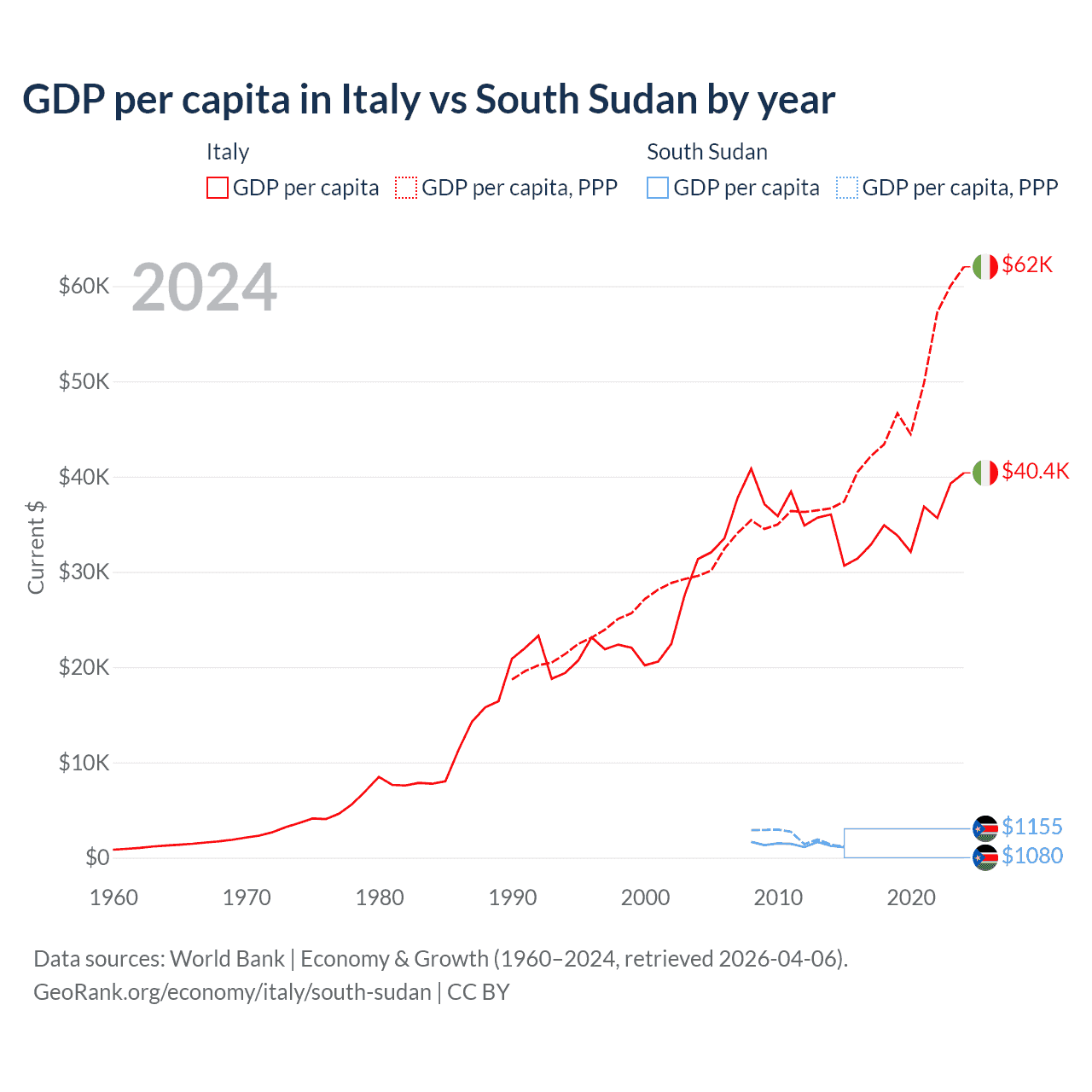 GDP per capita in Italy vs South Sudan by year