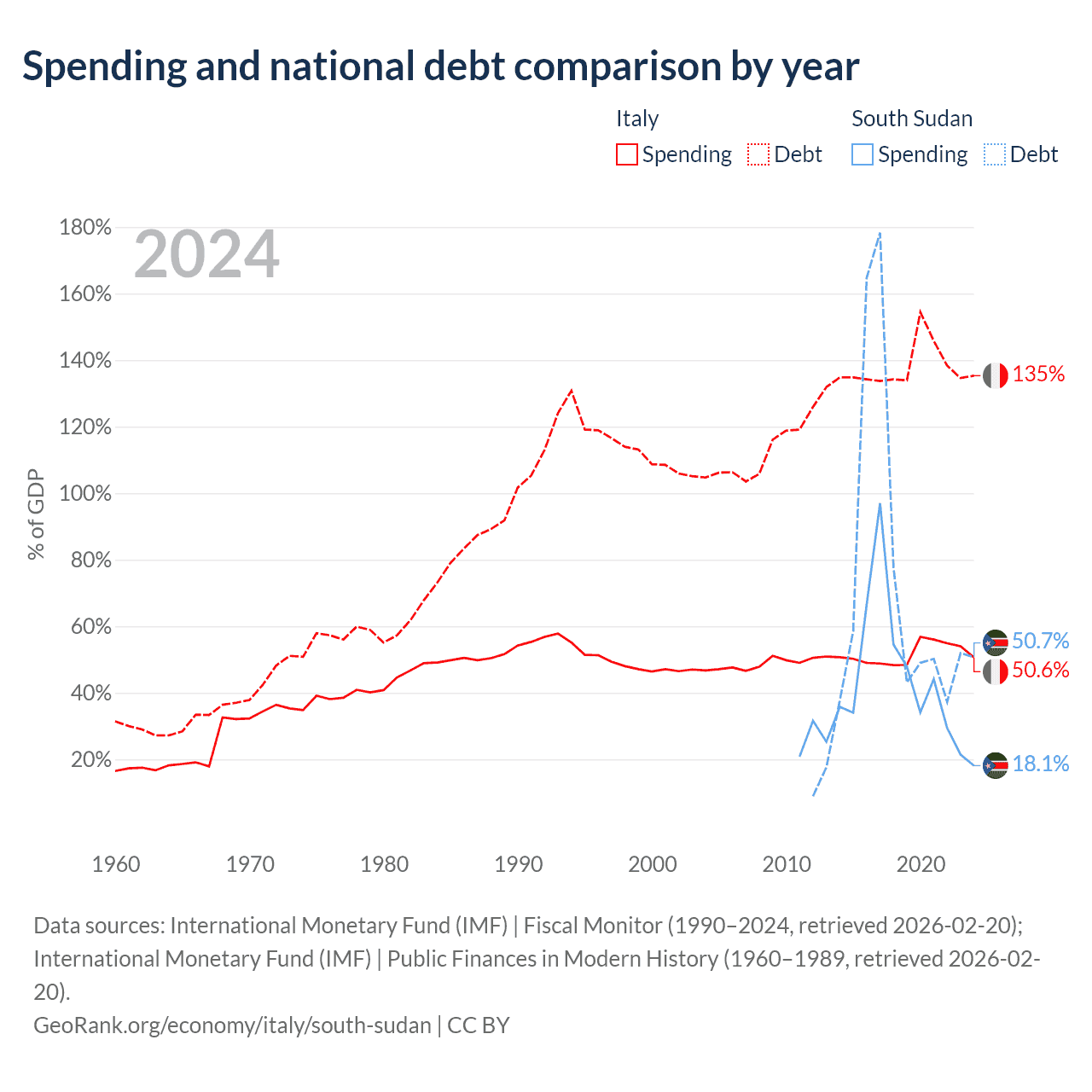 Italy has $3.22T in government debt (135.3% of GDP), compared to $7.04B (50.7% of GDP) in South Sudan.