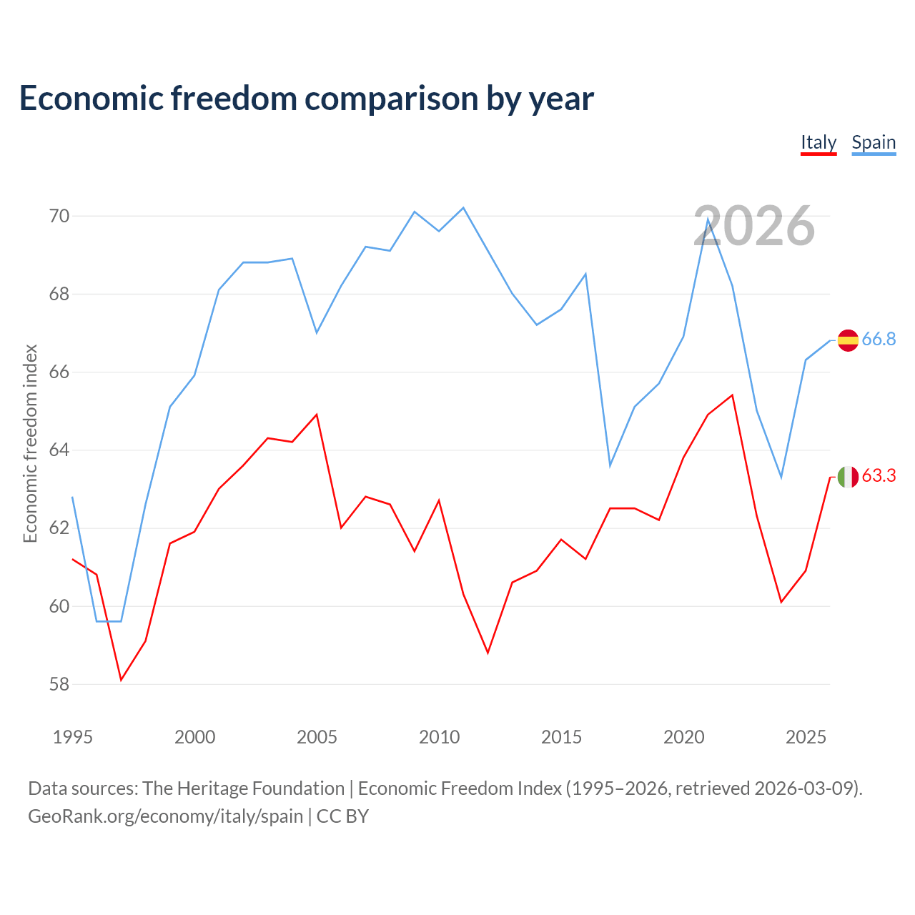 Data sources: The Heritage Foundation | Economic Freedom Index (1995–2026, retrieved 2026-03-09).