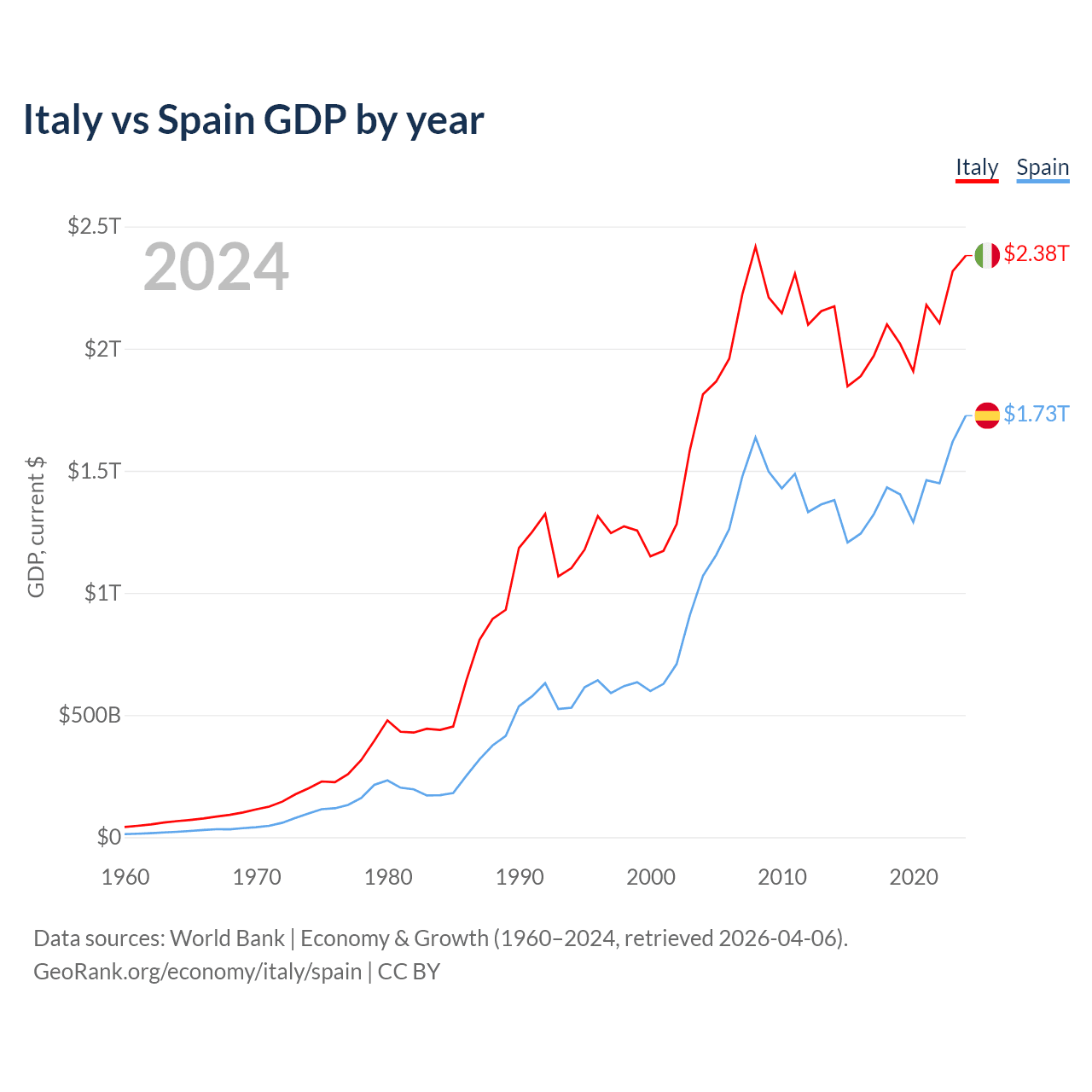 Italy vs Spain GDP by year